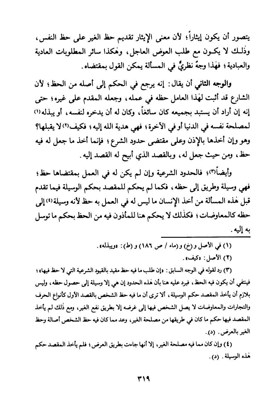 3 رد لقوله في الوجه السابق: "إن طلب ما فيه حظ مقيد بالقيود الشرعية التي لا حظَّ فيها"، فينتفي أن يكون فيه الحظ، فيرد عليه هنا بأن هذه الحدود إن هي إلا وسيلة إلى حصول حظه، وليس بلازم أن يأخذ المقصد حكم الوسيلة، ألا ترى أن ما فيه حظ الشخص بالقصد الأول كأنواع الحرف والتجارات والمعاوضات لا يصل الشخص فيها إلى غرضه إلا بطريق نفع الغير، ومع ذلك لم يأخذ المقصد فيها حكم ما كان في طريقها من مصلحة الغير، وعد مما كان فيه حظ الشخص أصالة وحظ الغير بالعرض. "د".