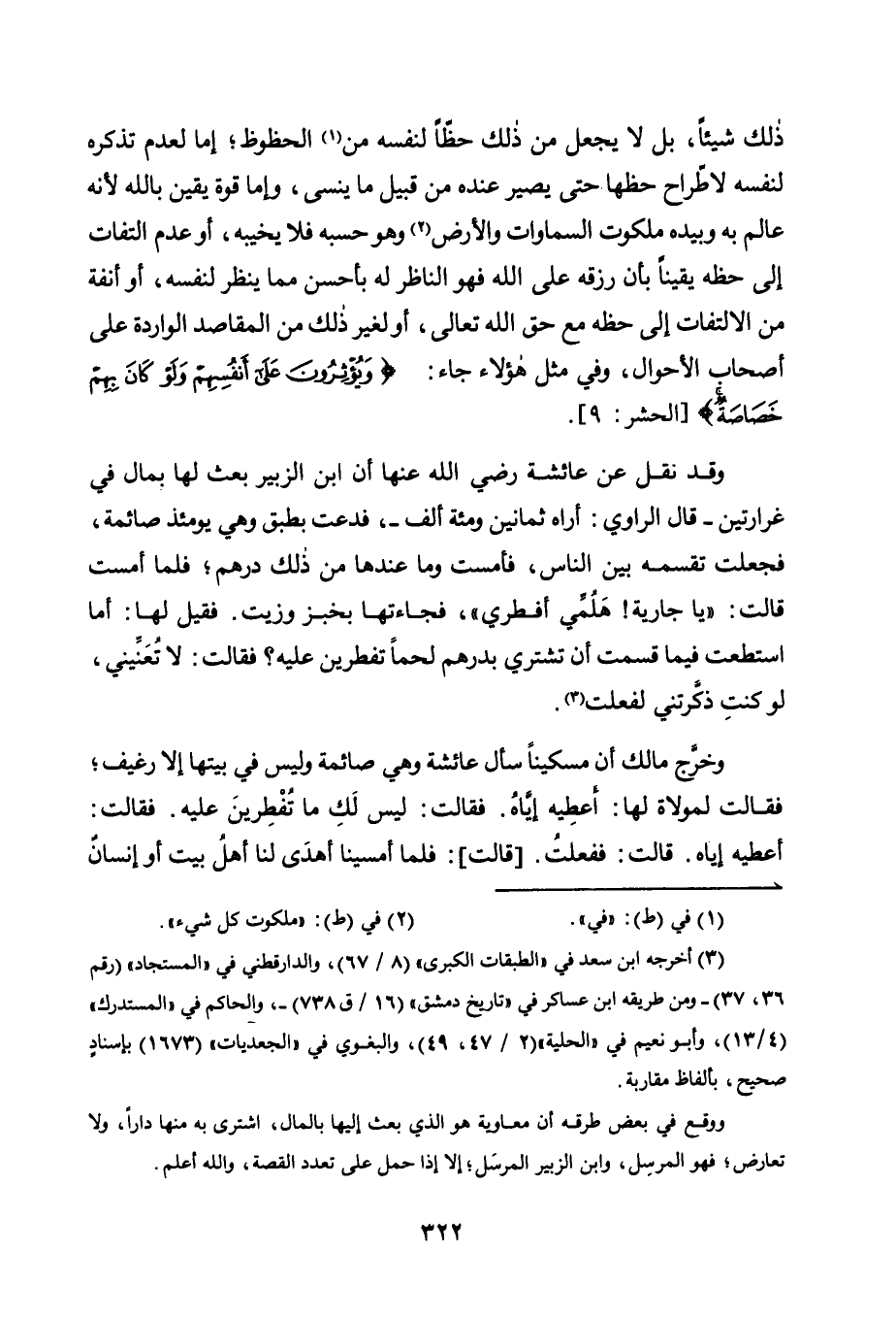 ذَلِكَ شَيْئًا، بَلْ لَا يَجْعَلُ مِنْ ذَلِكَ حَظًّا لِنَفْسِهِ مِنَ1 الْحُظُوظِ؛ إِمَّا لِعَدَمِ تَذَكُّرِهِ لنفسه لاطراح حظها حتى يصير مِنْ قَبِيلِ مَا يُنْسَى، وَإِمَّا قُوَّةُ يَقِينٍ بالله؛ لأنه عالم به وبيده ملكوت السموات وَالْأَرْضِ2 وَهُوَ حَسْبُهُ فَلَا يُخَيِّبُهُ، أَوْ عَدَمُ الْتِفَاتٍ إِلَى حَظِّهِ يَقِينًا بِأَنَّ رِزْقَهُ عَلَى اللَّهِ فَهُوَ النَّاظِرُ لَهُ بِأَحْسَنِ مِمَّا يَنْظُرُ لِنَفْسِهِ، أَوْ أَنَفَةً مِنَ الِالْتِفَاتِ إِلَى حَظِّهِ مَعَ حَقِّ اللَّهِ تَعَالَى، أَوْ لِغَيْرِ ذَلِكَ مِنَ الْمَقَاصِدِ الْوَارِدَةِ عَلَى أَصْحَابِ الْأَحْوَالِ، وَفِي مِثْلِ هَؤُلَاءِ جَاءَ: {وَيُؤْثِرُونَ عَلَى أَنْفُسِهِمْ وَلَوْ كَانَ بِهِمْ خَصَاصَةٌ} [الْحَشْرِ: 9] .