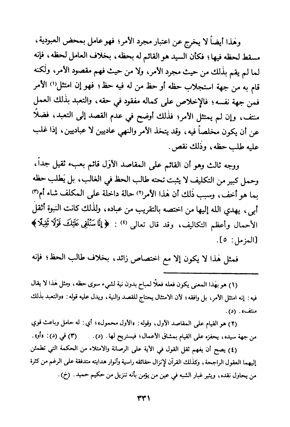 وَوَجْهٌ ثَالِثٌ وَهُوَ أَنَّ الْقَائِمَ عَلَى الْمَقَاصِدِ الأُوَل قَائِمٌ بِعِبْءٍ ثَقِيلٍ جِدًّا، وَحِمْلٍ كَبِيرٍ مِنَ التَّكْلِيفِ لَا يَثْبُتُ تَحْتَهُ طَالِبُ الْحَظِّ فِي الْغَالِبِ، بَلْ يَطْلُبُ حَظَّهُ بِمَا هُوَ أَخَفُّ، وَسَبَبُ ذَلِكَ أَنَّ هَذَا الأمر2 حالة داخلة على المكلف شاء أم3 أَبَى، يَهْدِي اللَّهُ إِلَيْهَا مَنِ اخْتَصَّهُ بِالتَّقْرِيبِ مِنْ عِبَادِهِ، وَلِذَلِكَ كَانَتِ النُّبُوَّةُ أَثْقَلَ الْأَحْمَالِ وَأَعْظَمَ التَّكَالِيفِ، وَقَدْ قَالَ تَعَالَى4: {إِنَّا سَنُلْقِي عَلَيْكَ قَوْلًا ثَقِيلًا} [الْمُزَّمِّلِ: 5] .