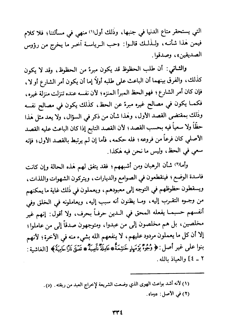 وَأَمَّا2 شَأْنُ الرُّهْبَانِ وَمَنْ أَشْبَهَهُمْ، فَقَدْ يَتَّفِقُ لَهُمْ هَذِهِ الْحَالَةُ وَإِنْ كَانَتْ فَاسِدَةَ الْوَضْعِ، فَيَنْقَطِعُونَ فِي الصَّوَامِعِ وَالدِّيَارَاتِ، وَيَتْرُكُونَ الشَّهَوَاتِ وَاللَّذَّاتِ، وَيُسْقِطُونَ حُظُوظَهُمْ فِي التَّوَجُّهِ إِلَى مَعْبُودِهِمْ، وَيَعْمَلُونَ فِي ذَلِكَ غَايَةَ مَا يُمْكِنُهُمْ مِنْ وُجُوهِ التَّقَرُّبِ إِلَيْهِ، وَمَا يَظُنُّونَ أَنَّهُ سَبَبٌ إِلَيْهِ، وَيُعَامِلُونَهُ فِي الْخَلْقِ وَفِي أَنْفُسِهِمْ حَسْبَمَا يَفْعَلُهُ الْمُحِقُّ فِي الدِّينِ حَرْفًا بِحَرْفٍ، وَلَا أَقُولُ: "إِنَّهُمْ غَيْرُ مُخْلِصِينَ، بَلْ هُمْ مُخْلِصُونَ إلى من عبدوا، ومتوجهون صدقا إلى من عَامَلُوا، إِلَّا أَنَّ كُلَّ مَا يَعْمَلُونَ مَرْدُودٌ عَلَيْهِمْ، لَا يَنْفَعُهُمُ اللَّهُ بِشَيْءٍ مِنْهُ فِي الْآخِرَةِ؛ لِأَنَّهُمْ بَنَوْا عَلَى غَيْرِ أَصْلٍ: {وُجُوهٌ يَوْمَئِذٍ خَاشِعَةٌ، عَامِلَةٌ نَاصِبَةٌ، تَصْلَى نَارًا حَامِيَةً} [الغاشية: 2-4] والعياذ بالله.