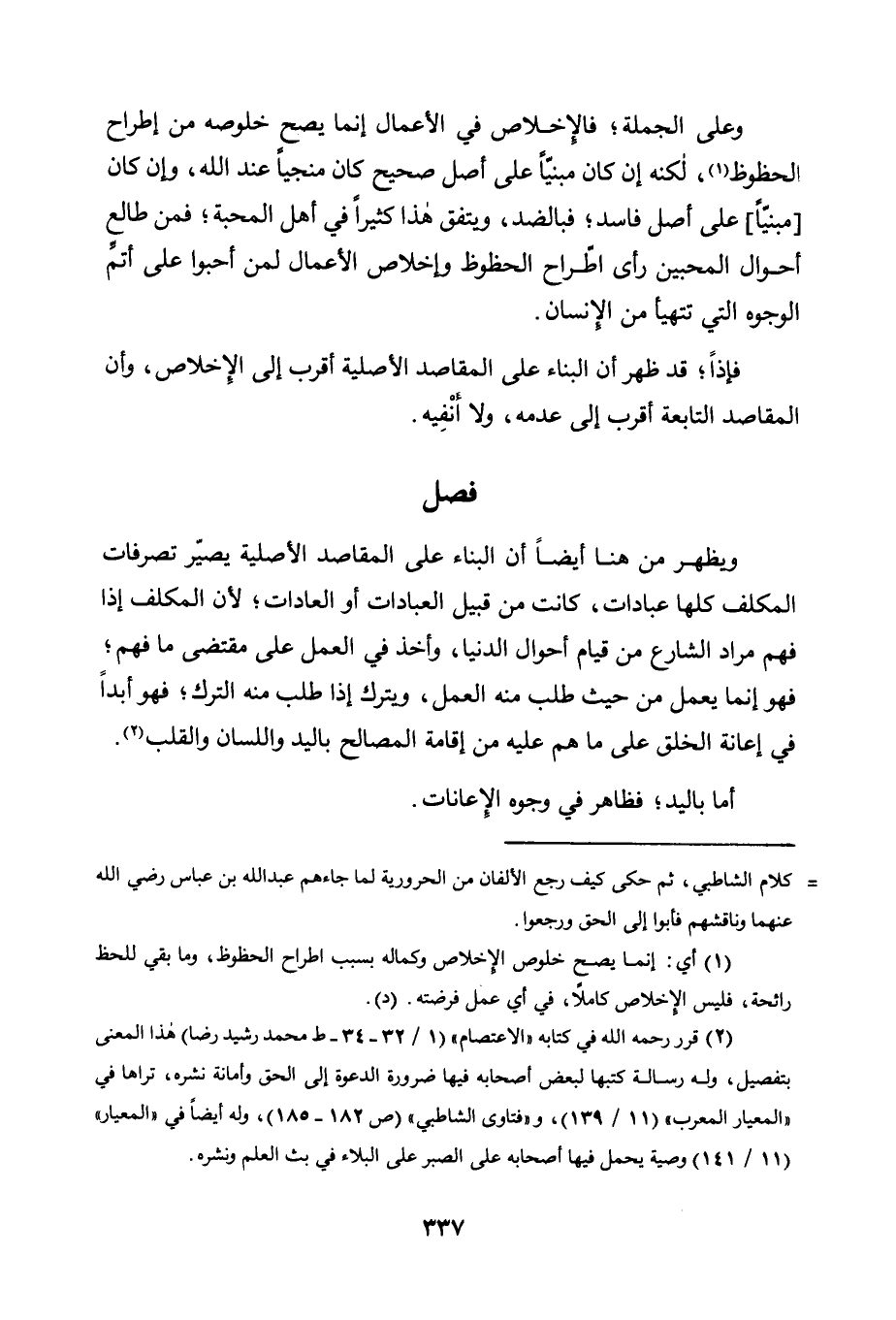 فإذن، قَدْ ظَهَرَ أَنَّ الْبِنَاءَ عَلَى الْمَقَاصِدِ الْأَصْلِيَّةِ أَقْرَبُ إِلَى الْإِخْلَاصِ، وَأَنَّ الْمَقَاصِدَ التَّابِعَةَ أَقْرَبُ إِلَى عَدَمِهِ، وَلَا أَنْفِيهِ.