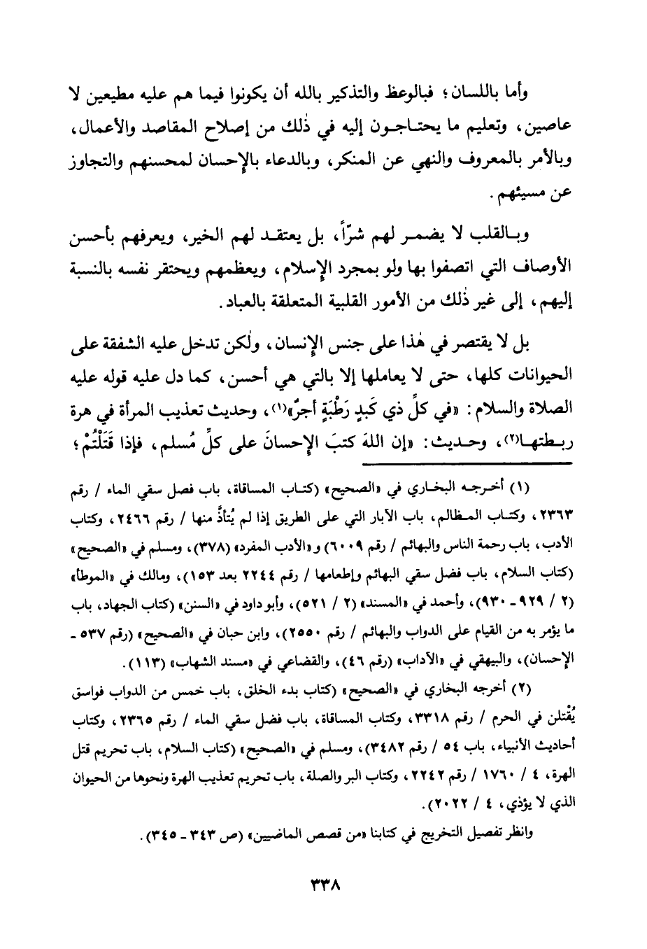بَلْ لَا يَقْتَصِرُ فِي هَذَا عَلَى جِنْسِ الْإِنْسَانِ، وَلَكِنْ تَدْخُلُ عَلَيْهِ الشَّفَقَةُ عَلَى الْحَيَوَانَاتِ كُلِّهَا، حَتَّى لَا يُعَامِلَهَا إِلَّا بِالَّتِي هِيَ أَحْسَنُ، كَمَا دَلَّ عَلَيْهِ قَوْلُهُ عَلَيْهِ الصَّلَاةُ وَالسَّلَامُ: "فِي كُلِّ ذِي كَبِدٍ رَطْبَةٍ أجرٌ" 1، وَحَدِيثُ تَعْذِيبِ الْمَرْأَةِ فِي هِرَّةٍ رَبَطَتْهَا"2، وَحَدِيثُ: "إِنَّ اللَّهَ كَتَبَ الْإِحْسَانَ عَلَى كل مسلم، فإذا قتلتم،