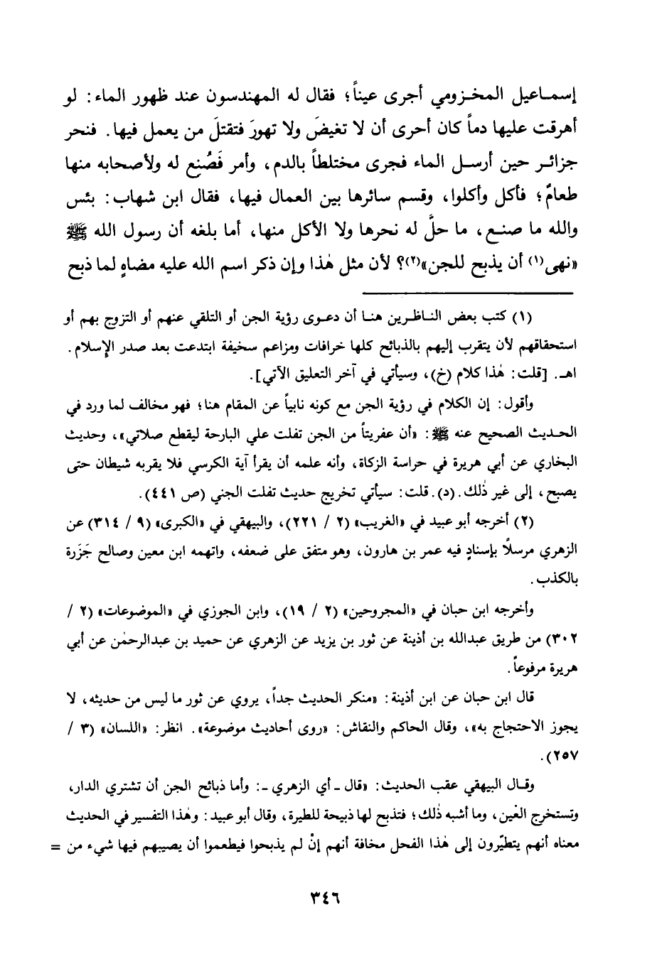 إِسْمَاعِيلَ الْمَخْزُومِيَّ أَجْرَى عَيْنًا، فَقَالَ لَهُ الْمُهَنْدِسُونَ عِنْدَ ظُهُورِ الْمَاءِ: لَوْ أَهْرَقْتَ عَلَيْهَا دَمًا كَانَ أَحْرَى أَنْ لَا تَغِيضَ وَلَا تَهُورَ، فَتَقْتُلَ مَنْ يَعْمَلُ فِيهَا. فَنَحَرَ جَزَائِرَ حِينَ أُرْسِلَ الْمَاءُ فَجَرَى مُخْتَلِطًا بِالدَّمِ، وَأَمَرَ فَصُنِعَ لَهُ وَلِأَصْحَابِهِ مِنْهَا طَعَامٌ، فَأَكَلَ وَأَكَلُوا، وَقَسَمَ سَائِرَهَا بَيْنَ الْعُمَّالِ فِيهَا، فَقَالَ ابْنُ شِهَابٍ: بِئْسَ وَاللَّهِ مَا صَنَعَ، مَا حَلَّ لَهُ نَحْرُهَا وَلَا الْأَكْلُ مِنْهَا، أَمَا بَلَغَهُ أَنَّ رَسُولَ اللَّهِ صَلَّى اللَّهُ عَلَيْهِ وَسَلَّمَ "نَهَى1 أَنْ يُذبَح لِلْجِنِّ"2؛ لِأَنَّ مِثْلَ هَذَا وَإِنْ ذُكِرَ اسْمُ اللَّهِ عَلَيْهِ مضاهٍ لِمَا ذُبِحَ