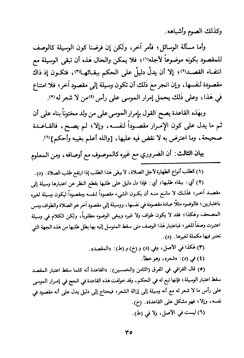 5 قال القرافي في الفرق "الثامن والخمسين" "القاعدة أنه كلما سقط اعتبار المقصد سقط اعتبار الوسيلة، فإنها تبع له في الحكم، وقد خولفت هذه القاعدة في الحج في إمرار الموسى على رأس ما لا شعر له مع أنه وسيلة إلى إزالة الشعر، فيحتاج إلى دليل يدل على أنه مقصود في نفسه، وإلا، فهو مشكل على القاعدة". "خ".