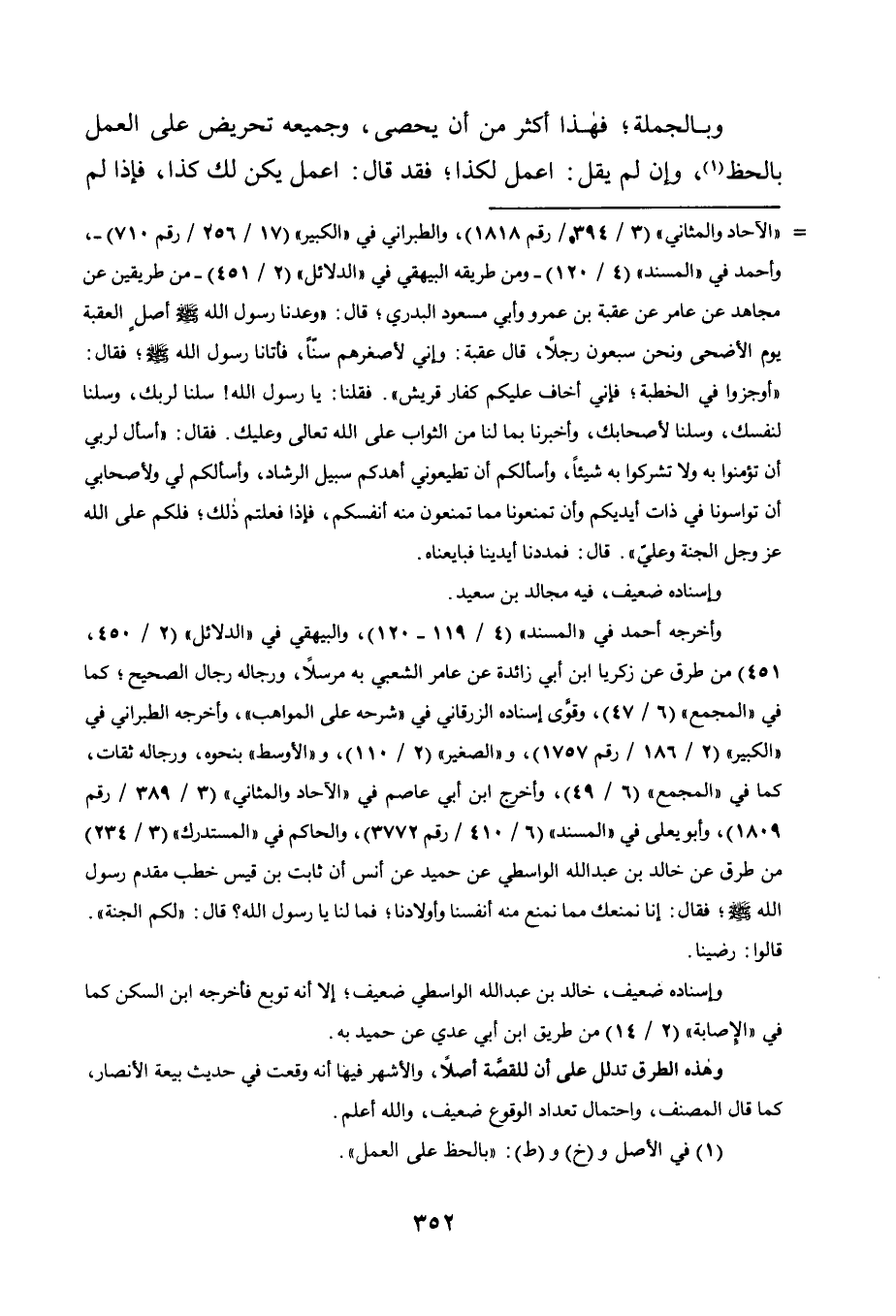 = الآحاد والمثاني" "3/ 394/ رقم 1818"، والطبراني في "الكبير" "17/ 256/ رقم 710"- وأحمد في المسند" "4/ 120" -ومن طريقه البيهقي في "الدلائل" "2/ 451"- من طريقين عن مجاهد عن عامر عن عقبة بن عمرو وأبي مسعود البدري، قال: "وعدنا رسول الله صلى الله عليه وسلم أصيل العقبة يوم الأضحى ونحن سبعون رجلا، قال عقبة: وإني لأصغرهم سنا، فأتانا رسول الله صلى الله عليه وسلم، فقال: "أوجزوا في الخطبة، فإني أخاف عليكم كفار قريش". فقلنا: يا رسول الله! سلنا لربك، وسلنا لنفسك، وسلنا لأصحابك، وأخبرنا بما لنا من الثواب على الله تعالى وعليك. فقال: "أسأل لربي أن تؤمنوا به ولا تشركوا به شيئا، وأسألكم أن تطيعوني أهدِكم سبيل الرشاد، وأسألكم لي ولأصحابي أن تواسونا في ذات أيديكم وأن تمنعونا مما تمنعون منه أنفسكم، فإذا فعلتم ذلك، فلكم على الله عز وجل الجنة وعلي". قال: فمددنا أيدينا فبايعناه.
