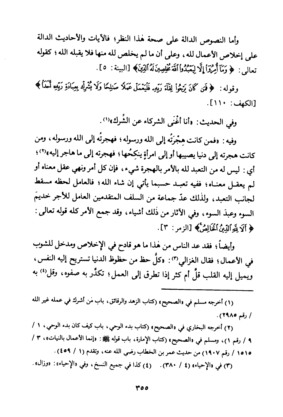 وَأَمَّا النُّصُوصُ الدَّالَّةُ عَلَى صِحَّةِ هَذَا النَّظَرِ، فَالْآيَاتُ وَالْأَحَادِيثُ الدَّالَّةُ عَلَى إِخْلَاصِ الْأَعْمَالِ لِلَّهِ، وَعَلَى أَنَّ مَا لَمْ يَخْلُصْ لِلَّهِ مِنْهَا فَلَا يَقْبَلُهُ اللَّهُ، كَقَوْلِهِ تَعَالَى: {وَمَا أُمِرُوا إِلَّا لِيَعْبُدُوا اللَّهَ مُخْلِصِينَ لَهُ الدِّين} [الْبَيِّنَةِ: 5] .