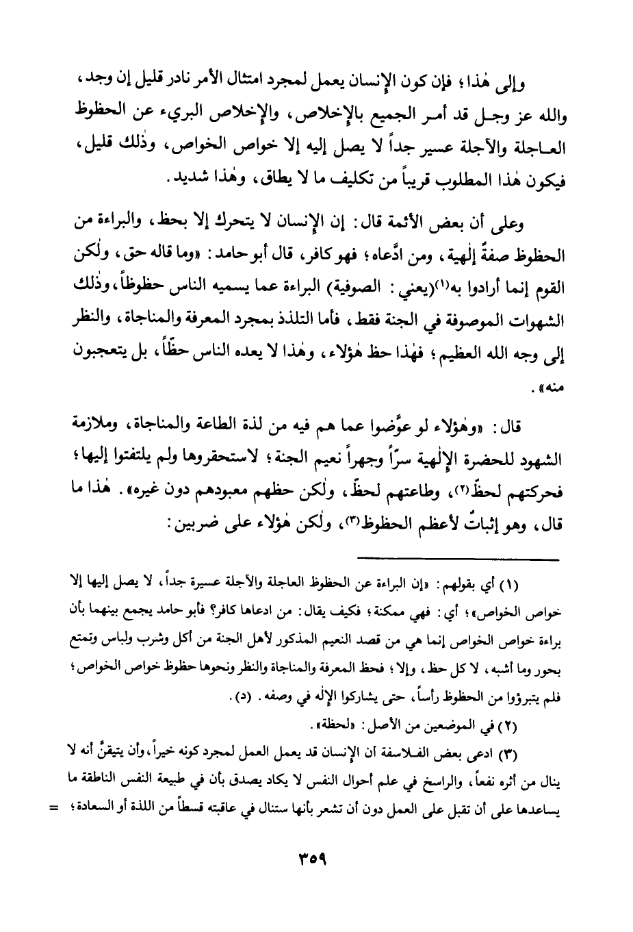 وَعَلَى أَنَّ بَعْضَ الْأَئِمَّةِ قَالَ: إِنَّ الْإِنْسَانَ لَا يَتَحَرَّكُ إِلَّا بِحَظٍّ، وَالْبَرَاءَةُ مِنَ الْحُظُوظِ صِفَةٌ إِلَهِيَّةٌ، وَمَنِ ادَّعَاهُ، فَهُوَ كَافِرٌ، قَالَ أَبُو حَامِدٍ: "وَمَا قَالَهُ حَقٌّ، وَلَكِنَّ الْقَوْمَ إِنَّمَا أَرَادُوا بِهِ1 "يَعْنِي: الصُّوفِيَّةَ" الْبَرَاءَةَ عَمَّا يُسَمِّيهِ النَّاسُ حُظُوظًا، وَذَلِكَ الشَّهَوَاتُ الْمَوْصُوفَةُ فِي الْجَنَّةِ فَقَطْ، فَأَمَّا التَّلَذُّذُ بِمُجَرَّدِ الْمَعْرِفَةِ وَالْمُنَاجَاةِ، وَالنَّظَرِ إِلَى وَجْهِ اللَّهِ الْعَظِيمِ، فَهَذَا حَظُّ هَؤُلَاءِ، وَهَذَا لَا يَعُدُّهُ النَّاسُ حَظًّا، بَلْ يَتَعَجَّبُونَ مِنْهُ".