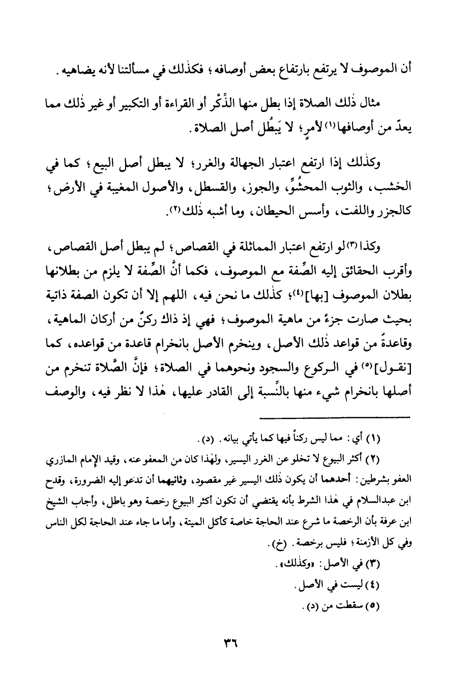 وَكَذَا3 لَوِ ارْتَفَعَ اعْتِبَارُ الْمُمَاثِلَةِ فِي الْقِصَاصِ، لَمْ يَبْطُلْ أَصْلُ الْقِصَاصِ، وَأَقْرَبُ الْحَقَائِقِ إِلَيْهِ الصِّفَةُ مَعَ الْمَوْصُوفِ، فَكَمَا أَنَّ الصِّفَةَ لَا يَلْزَمُ مِنْ بُطْلَانِهَا بُطْلَانُ الْمَوْصُوفِ [بِهَا] 4، كَذَلِكَ مَا نَحْنُ فِيهِ، اللَّهُمَّ إِلَّا أَنْ تَكُونَ الصِّفَةُ ذَاتِيَّةً بِحَيْثُ صَارَتْ جُزْءًا مِنْ مَاهِيَّةِ الْمَوْصُوفِ، فَهِيَ إِذْ ذَاكَ رُكْنٌ مِنْ أَرْكَانِ الْمَاهِيَّةِ، وَقَاعِدَةٌ مِنْ قَوَاعِدِ ذَلِكَ الْأَصْلِ، وَيَنْخَرِمُ الأصل بانخرام قاعدة من قواعده، كما [نقول] 5 فِي الرُّكُوعِ وَالسُّجُودِ وَنَحْوِهِمَا فِي الصَّلَاةِ، فَإِنَّ الصَّلَاةَ تَنْخَرِمُ مِنْ أَصْلِهَا بِانْخِرَامِ شَيْءٍ مِنْهَا بِالنِّسْبَةِ إِلَى الْقَادِرِ عَلَيْهَا، هَذَا لَا نَظَرَ فيه، والوصف