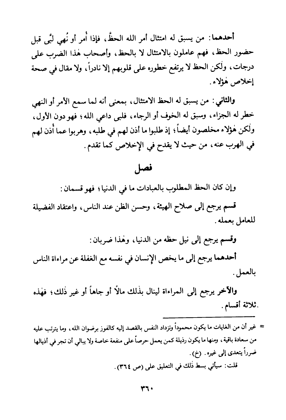 وَالْآخَرُ يَرْجِعُ إِلَى الْمُرَاءَاةِ لِيَنَالَ بِذَلِكَ مَالًا أَوْ جَاهًا أَوْ غَيْرَ ذَلِكَ، فَهَذِهِ ثَلَاثَةُ أَقْسَامٍ.