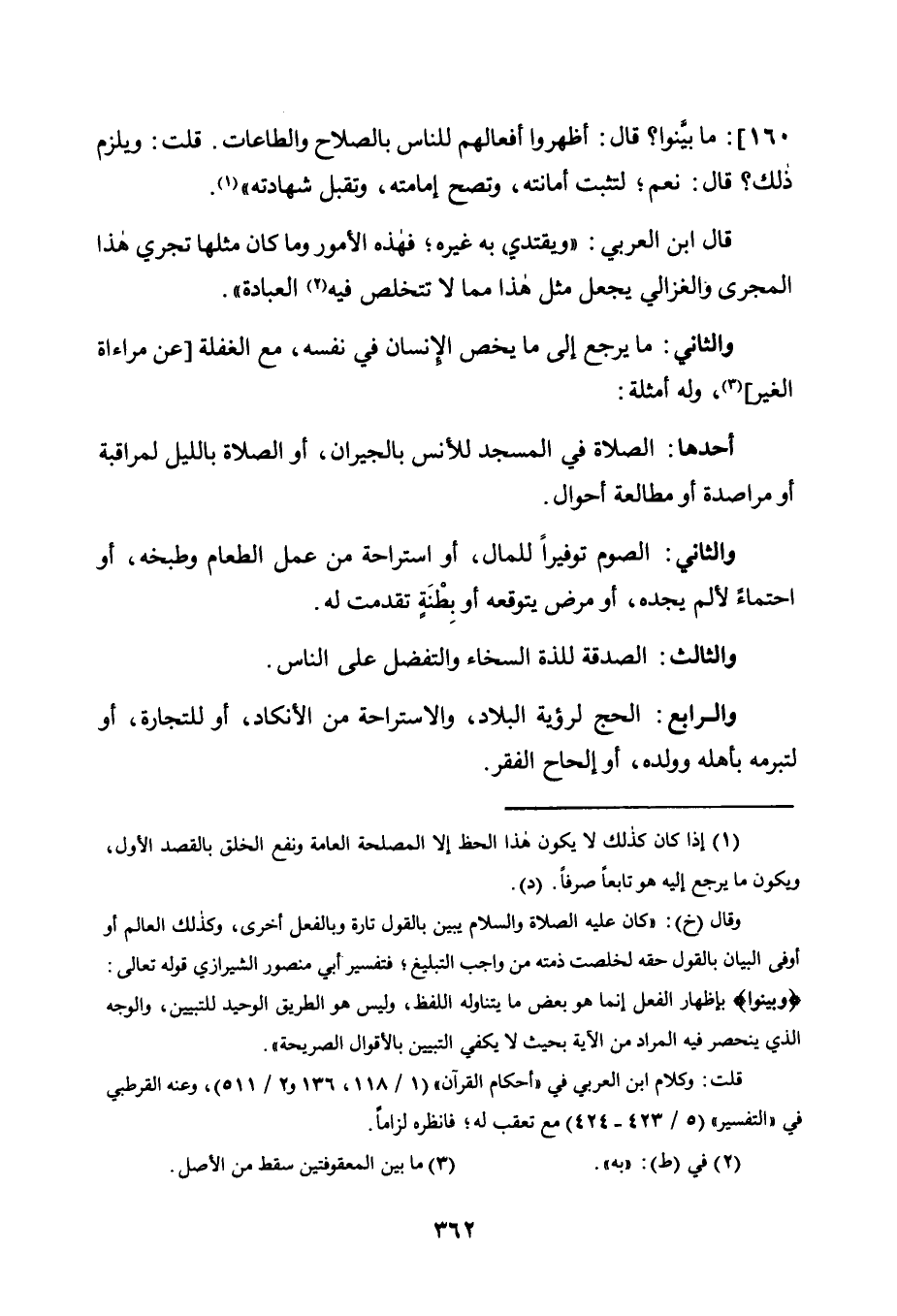 قَالَ ابْنُ الْعَرَبِيِّ: "وَيَقْتَدِي بِهِ غَيْرُهُ، فَهَذِهِ الْأُمُورُ وَمَا كَانَ مِثْلَهَا تَجْرِي هَذَا الْمَجْرَى وَالْغَزَالِيُ يَجْعَلُ مِثْلَ هَذَا مِمَّا لَا تَتَخَلَّصُ فِيهِ2 الْعِبَادَةُ".