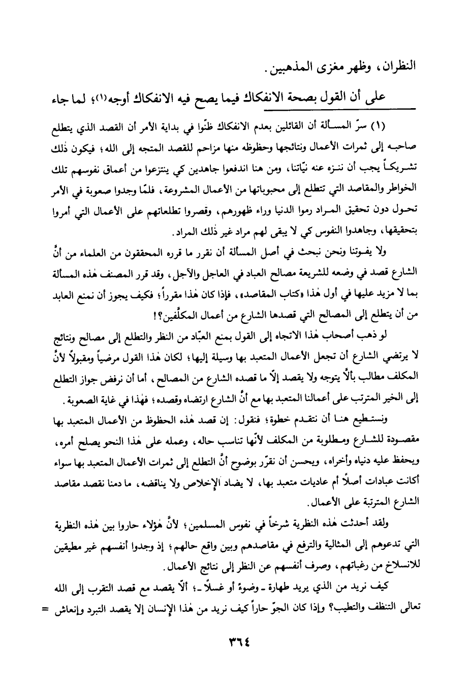 1 سر المسألة أن القائلين بعدم الانفكاك ظنوا في بداية الأمر أن القصد الذي يتطلع صاحبه إلى ثمرات الأعمال ونتائجها وحظوظه منها مزاحم للقصد المتجه إلى الله، فيكون ذلك تشريكا يجب أن ننزه عنه نياتنا، ومن هنا اندفعوا جاهدين كي ينتزعوا من أعماق نفوسهم تلك الخواطر والمقاصد التي تتطلع إلى محبوباتها من الأعمال المشروعة، فلما وجدوا صعوبة في الأمر تحول دون تحقيق المراد رموا الدنيا وراء ظهورهم، وقصروا تطلعاتهم على الأعمال التي أُمروا بتحقيقها، وجاهدوا النفوس كي لا يبقى لهم مراد غير ذلك المراد.
