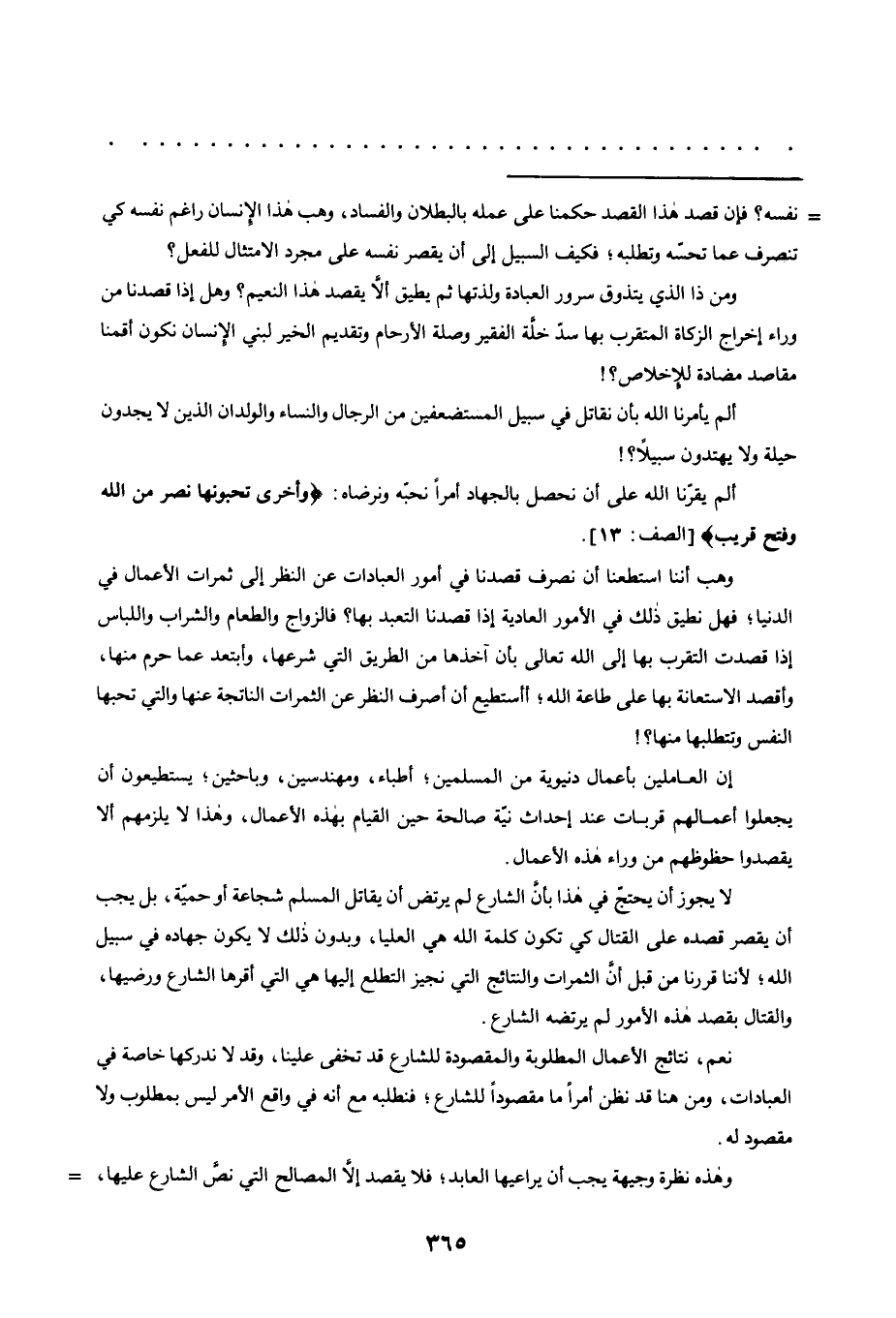 لا يجوز أن يحتج في هذا بأن الشارع لم يرتضِ أن يقاتل المسلم شجاعة أو حمية: بل يجب أن يقصر قصده على القتال كي تكون كلمة الله هي العليا، وبدون ذلك لا يكون جهاده في سبيل الله؛ لأننا قررنا من قبل أن الثمرات والنتائج التي نجيز التطلع إليها هي التي أقرها الشارع ورضيها، والقتال بقصد هذه الأمور لم يرتضه الشارع.