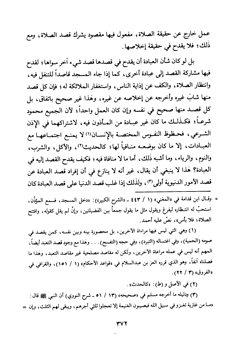 بَلْ لَوْ كَانَ شَأْنُ الْعِبَادَةِ أَنْ يَقْدَحَ فِي قَصْدِهَا قَصْدُ شيء آخر سواها، لَقَدَحَ فِيهَا مُشَارَكَةُ الْقَصْدِ إِلَى عِبَادَةٍ أُخْرَى، كَمَا إِذَا جَاءَ الْمَسْجِدَ قَاصِدًا لِلتَّنَفُّلِ فِيهِ، وَانْتِظَارِ الصَّلَاةِ، وَالْكَفِّ عَنْ إِذَايَةِ النَّاسِ، وَاسْتِغْفَارِ الْمَلَائِكَةِ لَهُ، فَإِنَّ كُلَّ قَصْدٍ مِنْهَا شَابَ غَيْرَهُ وَأَخْرَجَهُ عَنْ إِخْلَاصِهِ عَنْ غَيْرِهِ، وَهَذَا غَيْرُ صَحِيحٍ بِاتِّفَاقٍ، بَلْ كُلُّ قَصْدٍ مِنْهَا صَحِيحٌ فِي نَفْسِهِ وَإِنْ كَانَ الْعَمَلُ وَاحِدًا؛ لِأَنَّ الْجَمِيعَ مَحْمُودٌ شَرْعًا، فَكَذَلِكَ مَا كَانَ غَيْرَ عِبَادَةٍ مِنَ الْمَأْذُونِ فِيهِ، لِاشْتِرَاكِهِمَا فِي الْإِذْنِ الشَّرْعِيِّ، فَحُظُوظُ النُّفُوسِ الْمُخْتَصَّةِ بِالْإِنْسَانِ1 لَا يُمْنَعُ اجْتِمَاعُهَا مَعَ الْعِبَادَاتِ، إِلَّا مَا كَانَ بِوَضْعِهِ مُنَافِيًا لَهَا، كَالْحَدِيثِ2، وَالْأَكْلِ، وَالشُّرْبِ، وَالنَّوْمِ، وَالرِّيَاءِ، وَمَا أَشْبَهَ ذَلِكَ، أَمَّا مَا لَا مُنَافَاةَ فِيهِ، فَكَيْفَ يَقْدَحُ الْقَصْدُ إِلَيْهِ فِي الْعِبَادَةِ؟ هَذَا لَا يَنْبَغِي أَنْ يُقَالَ، غَيْرَ أَنَّهُ لَا يُنَازَعُ فِي أَنَّ إِفْرَادَ قَصْدِ الْعِبَادَةِ عَنْ قَصْدِ الْأُمُورِ الدُّنْيَوِيَّةِ أَوْلَى3، وَلِذَلِكَ إِذَا غَلَبَ قَصْدُ الدُّنْيَا عَلَى قَصْدِ الْعِبَادَةِ كان