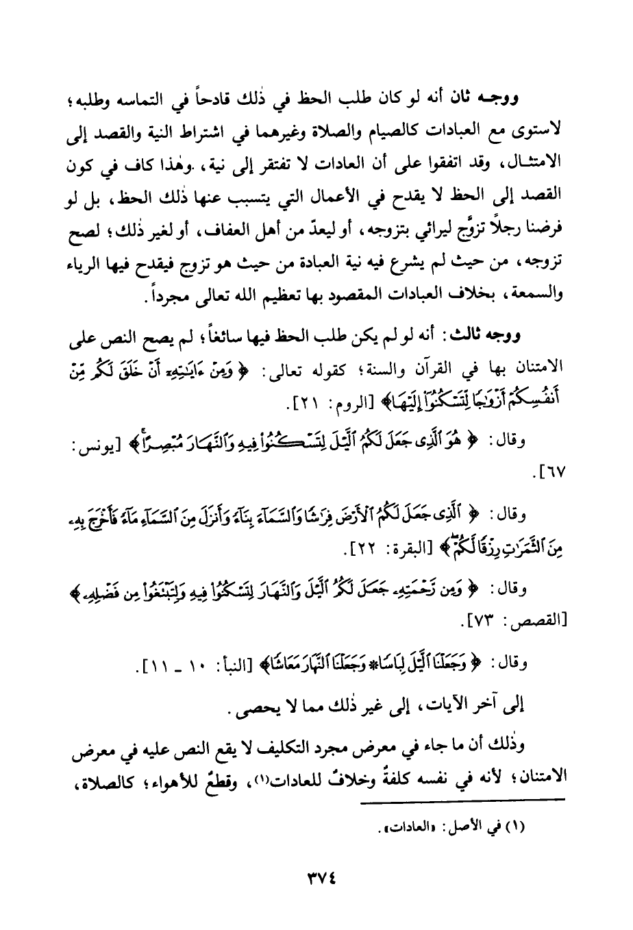 وَوَجْهٌ ثانٍ: أَنَّهُ لَوْ كَانَ طَلَبُ الْحَظِّ فِي ذَلِكَ قَادِحًا فِي الْتِمَاسِهِ وَطَلَبِهِ، لَاسْتَوَى مَعَ الْعِبَادَاتِ كَالصِّيَامِ وَالصَّلَاةِ وَغَيْرِهِمَا فِي اشْتِرَاطِ النِّيَّةِ وَالْقَصْدِ إِلَى الِامْتِثَالِ وَقَدِ اتَّفَقُوا عَلَى أَنَّ الْعَادَاتِ لَا تَفْتَقِرُ إِلَى نِيَّةٍ، وَهَذَا كافٍ فِي كَوْنِ الْقَصْدِ إِلَى الْحَظِّ لَا يَقْدَحُ فِي الْأَعْمَالِ الَّتِي يَتَسَبَّبُ عَنْهَا ذَلِكَ الْحَظُّ، بَلْ لَوْ فَرَضْنَا رَجُلًا تَزَوَّجَ لِيُرَائِيَ بِتَزَوُّجِهِ، أَوْ لِيُعَدَّ مِنْ أَهْلِ الْعَفَافِ، أَوْ لِغَيْرِ ذَلِكَ، لَصَحَّ تَزَوُّجُهُ، مِنْ حَيْثُ لَمْ يشرع فيه نية العبادة من حيث هو تَزَوَّجَ فَيَقْدَحَ فِيهَا الرِّيَاءُ وَالسُّمْعَةُ، بِخِلَافِ الْعِبَادَاتِ الْمَقْصُودِ بِهَا تَعْظِيمُ اللَّهِ تَعَالَى مُجَرَّدًا.