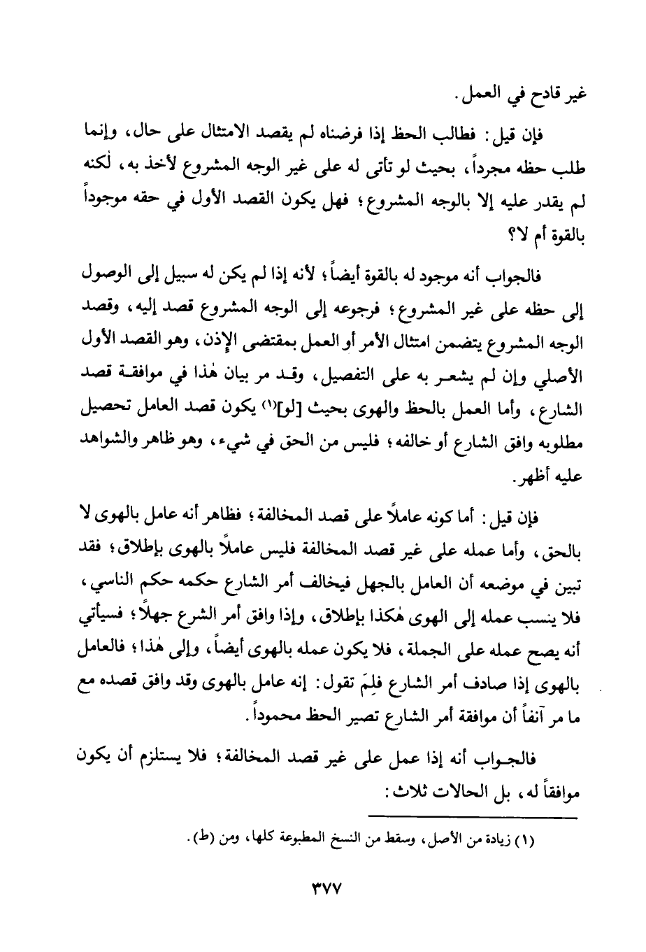 فَالْجَوَابُ أَنَّهُ مَوْجُودٌ لَهُ بِالْقُوَّةِ أَيْضًا؛ لِأَنَّهُ إِذَا لَمْ يَكُنْ لَهُ سَبِيلٌ إِلَى الْوُصُولِ إِلَى حَظِّهِ عَلَى غَيْرِ الْمَشْرُوعِ، فَرُجُوعُهُ إِلَى الْوَجْهِ الْمَشْرُوعِ قَصْدٌ إِلَيْهِ، وَقَصْدُ الْوَجْهِ الْمَشْرُوعِ يَتَضَمَّنُ امْتِثَالَ الْأَمْرِ أَوِ الْعَمَلَ بِمُقْتَضَى الْإِذْنِ، وَهُوَ الْقَصْدُ الْأَوَّلُ الْأَصْلِيُّ وَإِنْ لَمْ يَشْعُرْ بِهِ عَلَى التَّفْصِيلِ، وَقَدْ مَرَّ بَيَانُ هَذَا فِي مُوَافَقَةِ قَصْدِ الشَّارِعِ، وَأَمَّا الْعَمَلُ بِالْحَظِّ وَالْهَوَى بِحَيْثُ [لَوْ] 1 يَكُونُ قَصْدُ الْعَامِلِ تَحْصِيلَ مَطْلُوبِهِ وَافَقَ الشَّارِعُ أَوْ خَالَفَهُ، فَلَيْسَ مِنَ الْحَقِّ فِي شَيْءٍ، وَهُوَ ظَاهِرٌ وَالشَّوَاهِدُ عَلَيْهِ أَظْهَرُ.