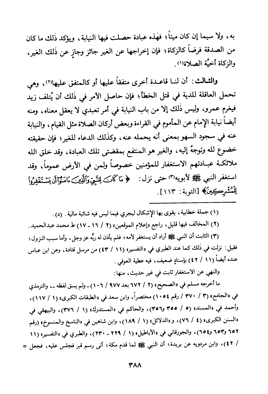 أَنَّ لَنَا قَاعِدَةً أُخْرَى مُتَّفَقًا عَلَيْهَا أَوْ كَالْمُتَّفَقِ عَلَيْهَا2، وَهَى تَحَمُّلُ الْعَاقِلَةِ لِلدِّيَةِ فِي قَتْلِ الْخَطَأِ، فَإِنَّ حَاصِلَ الْأَمْرِ فِي ذَلِكَ أَنْ يُتْلِفَ زَيْدٌ فَيُغَرَّمُ عَمْرٌو، وَلَيْسَ ذَلِكَ إِلَّا مِنْ بَابِ النِّيَابَةِ فِي أَمْرٍ تَعَبُّدِيٍّ لَا يُعْقَلُ مَعْنَاهُ، وَمِنْهُ أَيْضًا نِيَابَةُ الْإِمَامِ عَنِ الْمَأْمُومِ فِي الْقِرَاءَةِ وَبَعْضِ أَرْكَانِ الصَّلَاةِ مِثْلَ الْقِيَامِ، وَالنِّيَابَةُ عَنْهُ فِي سُجُودِ السَّهْوِ بِمَعْنَى أَنَّهُ يَحْمِلُهُ عَنْهُ، وَكَذَلِكَ الدُّعَاءُ لِلْغَيْرِ، فَإِنَّ حَقِيقَتَهُ خُضُوعٌ لِلَّهِ وَتَوَجُّهٌ إِلَيْهِ، وَالْغَيْرُ هُوَ الْمُنْتَفِعُ بِمُقْتَضَى تِلْكَ الْعِبَادَةِ، وَقَدْ خَلَقَ اللَّهُ مَلَائِكَةً عِبَادَتُهُمْ الِاسْتِغْفَارُ لِلْمُؤْمِنِينَ خُصُوصًا وَلِمَنْ فِي الْأَرْضِ عُمُومًا، وَقَدِ اسْتَغْفَرَ النَّبِيُّ صَلَّى اللَّهُ عَلَيْهِ وَسَلَّمَ لِأَبَوَيْهِ3 حَتَّى نَزَلَ: {مَا كَانَ لِلنَّبِيِّ وَالَّذِينَ آمَنُوا أَنْ يَسْتَغْفِرُوا لِلْمُشْرِكِينَ} [التوبة: 113] .