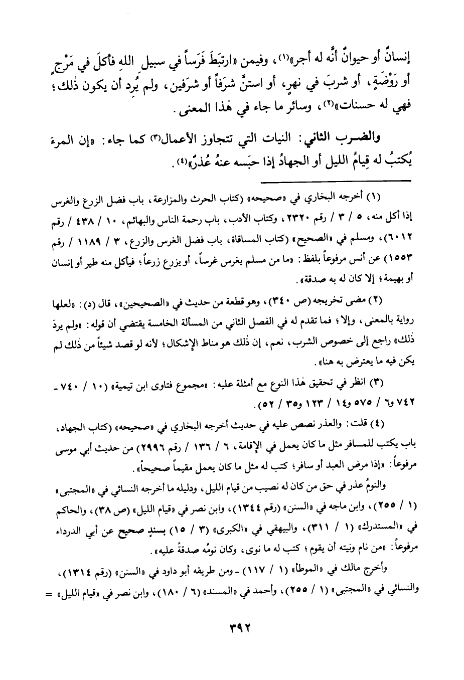 إِنْسَانٌ أَوْ حَيَوَانٌ أَنَّهُ لَهُ أَجْرٌ" 1 وَفِيمَنِ "ارْتَبَطَ فَرَسًا فِي سَبِيلِ اللَّهِ فَأَكَلَ فِي مَرْجٍ أَوْ رَوْضَةٍ، أَوْ شَرِبَ فِي نَهْرٍ، أَوِ استنَّ شَرَفًا أَوْ شَرَفَيْنِ، وَلَمْ يُرِدْ أَنْ يَكُونَ ذَلِكَ، فَهِيَ لَهُ حَسَنَاتٌ" 2، وَسَائِرُ مَا جَاءَ فِي هَذَا الْمَعْنَى.