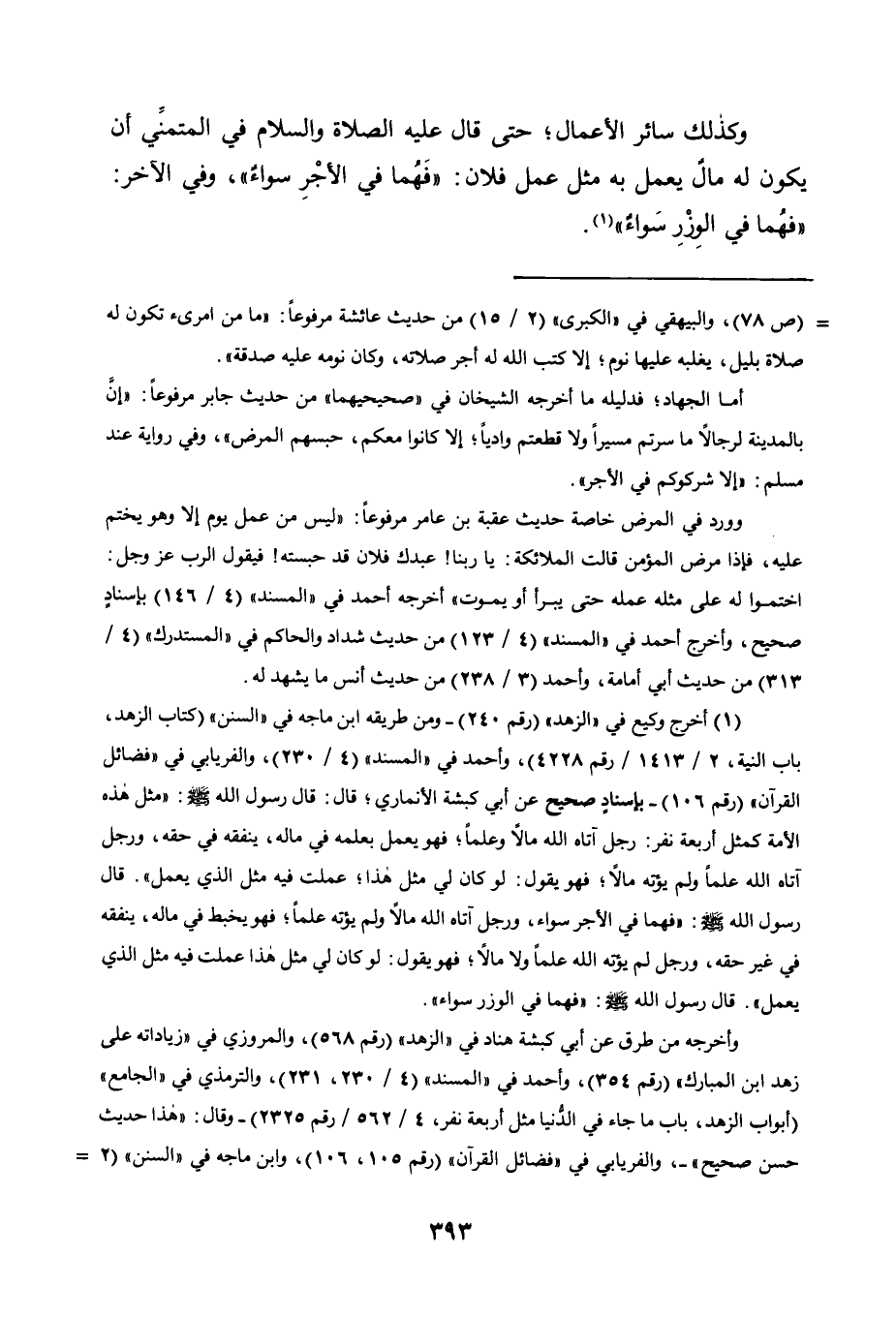 1أخرج وكيع في "الزهد" "رقم 240" -ومن طريقه ابن ماجه في "السنن" "كتاب الزهد، باب النية 2/ 1413/ 4228"، وأحمد في "المسند" "4/ 230"، والفريابي في "فضائل القرآن" "رقم 106"- بإسناد صحيح عن أبي كبشة الأنماري: قال: قال رسول الله صلى الله عليه وسلم: "مثل هذه الأمة كمثل أربعة نفر: رجل آتاه الله مالا وعلما، فهو يعمل بعلمه في ماله، ينفقه في حقه، ورجل آتاه الله علما ولم يؤته مالا، فهو يقول: لو كان لي مثل هذا، عملت فيه مثل الذي يعمل" قال رسول الله صلى الله عليه وسلم: "فهما في الأجر سواء، ورجل آتاه الله مالا ولم يؤته علما، فهو يخبط في ماله، ينفقه في غير حقه، ورجل لم يؤتِهِ الله علما ولا مالا، فهو يقول: لو كان لي مثل هذا عملت فيه مثل الذي يعمل" قال رسول الله صلى الله عليه وسلم: "فهما في الوزر سواء ".