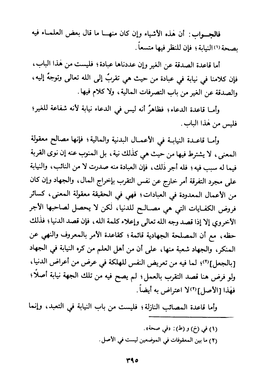 وَأَمَّا قَاعِدَةُ النِّيَابَةِ فِي الْأَعْمَالِ الْبَدَنِيَّةِ وَالْمَالِيَّةِ، فَإِنَّهَا مَصَالِحٌ مَعْقُولَةُ الْمَعْنَى، لَا يُشْتَرَطُ فِيهَا مِنْ حَيْثُ هِيَ كَذَلِكَ نِيَّةٌ، بَلِ الْمَنُوبُ عَنْهُ إِنْ نَوَى الْقُرْبَةَ فِيمَا لَهُ سَبَبٌ فِيهِ، فَلَهُ أَجْرُ ذَلِكَ، فَإِنَّ الْعِبَادَةَ مِنْهُ صَدَرَتْ لَا مِنَ النَّائِبِ، وَالنِّيَابَةُ عَلَى مُجَرَّدِ التَّفْرِقَةِ أَمْرٌ خَارِجٌ عَنْ نَفْسِ التَّقَرُّبِ بِإِخْرَاجِ الْمَالِ، وَالْجِهَادِ وَإِنْ كَانَ مِنَ الْأَعْمَالِ الْمَعْدُودَةِ فِي الْعِبَادَاتِ، فَهِيَ فِي الْحَقِيقَةِ مَعْقُولَةُ الْمَعْنَى، كَسَائِرِ فُرُوضِ الْكِفَايَاتِ الَّتِي هِيَ مَصَالِحُ للدنيا، لَكِنْ لَا يَحْصُلُ لِصَاحِبِهَا الْأَجْرُ الْأُخْرَوِيُّ إِلَّا إِذَا قَصَدَ وَجْهَ اللَّهِ تَعَالَى وَإِعْلَاءَ كَلِمَةِ اللَّهِ، فَإِنْ قَصَدَ الدُّنْيَا، فَذَلِكَ حَظُّهُ، مَعَ أَنَّ الْمَصْلَحَةَ الْجِهَادِيَّةَ قَائِمَةٌ، كَقَاعِدَةِ الْأَمْرِ بِالْمَعْرُوفِ وَالنَّهْيِ عَنِ الْمُنْكَرِ، وَالْجِهَادُ شُعْبَةٌ مِنْهَا، عَلَى أَنَّ مِنْ أَهْلِ الْعِلْمِ مَنْ كَرِهَ النِّيَابَةَ فِي الْجِهَادِ [بِالْجُعْلِ] 2، لِمَا فِيهِ مِنْ تَعْرِيضِ النَّفْسِ لِلْهَلَكَةِ فِي عَرْضٍ مِنْ أَعْرَاضِ الدُّنْيَا، وَلَوْ فُرِضَ هُنَا قَصْدُ التَّقَرُّبِ بِالْعَمَلِ، لَمْ يَصِحَّ فِيهِ مِنْ تِلْكَ الْجِهَةِ نِيَابَةٌ أَصْلًا، فَهَذَا [الْأَصْلُ] 2 لَا اعْتِرَاضَ بِهِ أَيْضًا.