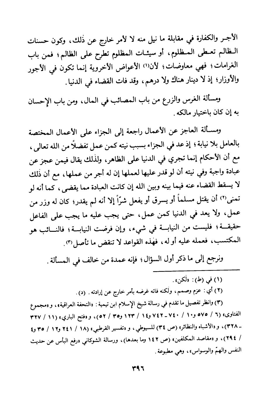 وَمَسْأَلَةُ الْعَاجِزِ عَنِ الْأَعْمَالِ رَاجِعَةٌ إِلَى الْجَزَاءِ عَلَى الْأَعْمَالِ الْمُخْتَصَّةِ بِالْعَامِلِ بِلَا نِيَابَةٍ؛ إِذْ عُدَّ فِي الْجَزَاءِ بِسَبَبِ نِيَّتِهِ كَمَنْ عَمِلَ تَفَضُّلًا مِنَ اللَّهِ تَعَالَى، مَعَ أَنَّ الْأَحْكَامَ إِنَّمَا تَجْرِي فِي الدُّنْيَا عَلَى الظَّاهِرِ، وَلِذَلِكَ يُقَالُ فِيمَنْ عَجَزَ عَنْ عِبَادَةٍ وَاجِبَةٍ وَفِي نِيَّتِهِ أَنْ لَوْ قَدَرَ عَلَيْهَا لَعَمِلَهَا إِنَّ لَهُ أَجْرَ مَنْ عَمِلَهَا، مَعَ أَنَّ ذَلِكَ لَا يُسْقِطُ الْقَضَاءَ عَنْهُ فِيمَا بَيْنَهُ وَبَيْنَ اللَّهِ إِنْ كَانَتِ الْعِبَادَةُ مِمَّا يُقْضَى، كَمَا أَنَّهُ لَوْ تَمَنَّى2 أَنْ يَقْتُلَ مُسْلِمًا أَوْ يَسْرِقَ أَوْ يَفْعَلَ شَرًّا إِلَّا أَنَّهُ لَمْ يَقْدِرْ، كَانَ لَهُ وِزْرُ مَنْ عَمِلَ، وَلَا يُعَدُّ فِي الدُّنْيَا كَمَنْ عَمِلَ، حَتَّى يَجِبَ عَلَيْهِ مَا يَجِبُ عَلَى الْفَاعِلِ حَقِيقَةً، فَلَيْسَتْ مِنَ النِّيَابَةِ فِي شَيْءٍ، وَإِنْ فُرِضَتِ النِّيَابَةُ، فَالنَّائِبُ هُوَ الْمُكْتَسِبُ، فَعَمَلُهُ عَلَيْهِ أَوْ لَهُ، فَهَذِهِ الْقَوَاعِدُ لَا تَنْقُضُ مَا تَأَصَّلَ3.