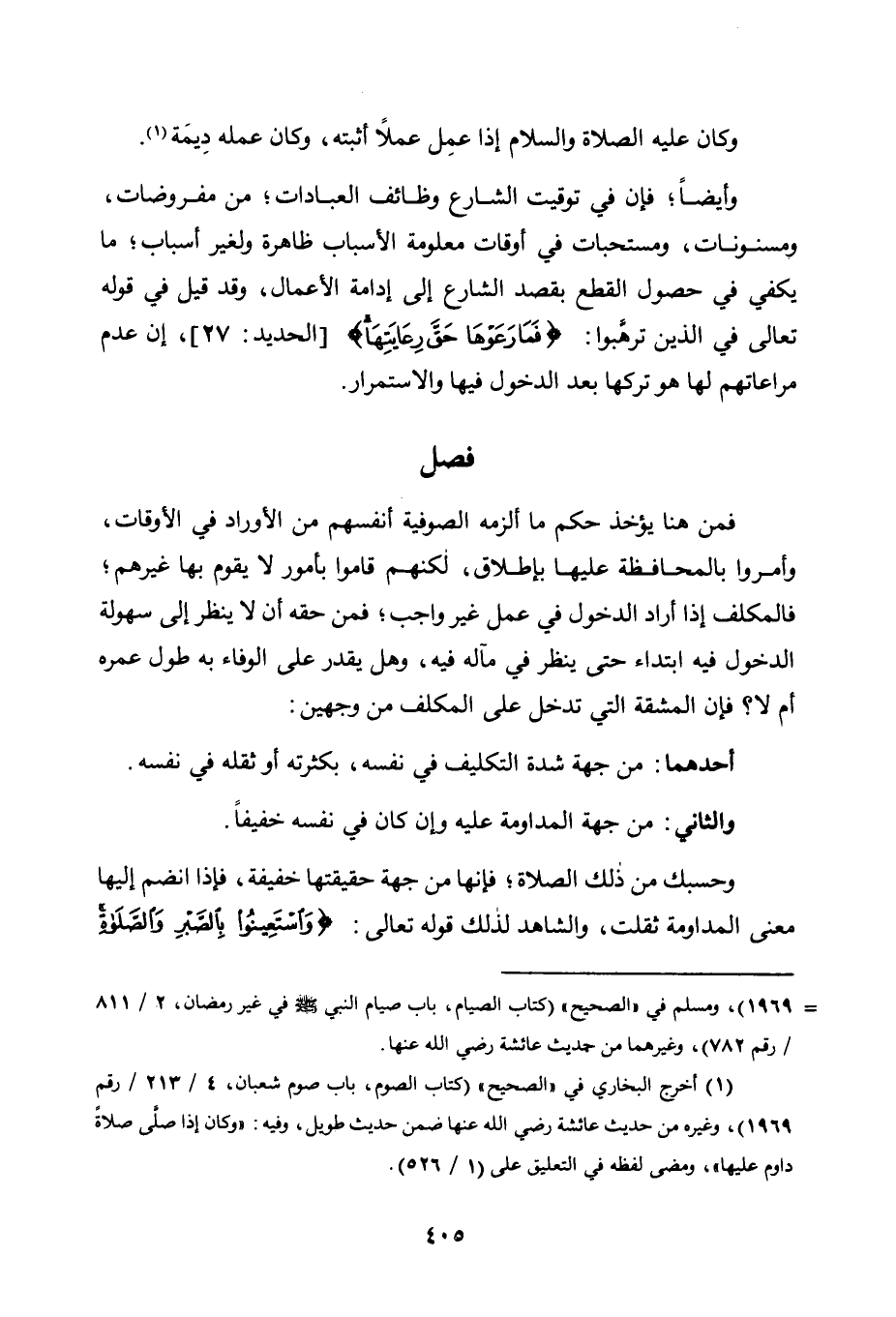 1 أخرج البخاري في "الصحيح" "كتاب الصوم، باب صوم شعبان، 4/ 213/ رقم 1969"، وغيره من حديث عائشة رضي الله عنها ضمن حديث طويل، وفيه: "وكان إذا صلى صلاة داوم عليها" ومضى لفظه في التعليق على "1/ 526".