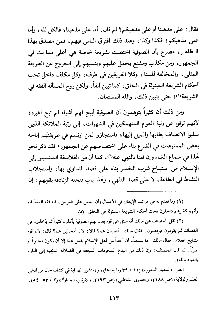فَقَالَ: عَلَى مَذْهَبِنَا أَوْ عَلَى مَذْهَبِكُمْ؟ ثُمَّ قَالَ: أمَّا عَلَى مَذْهَبِنَا، فَالْكُلُّ لِلَّهِ، وَأَمَّا عَلَى مَذْهَبِكُمْ، فَكَذَا وَكَذَا، وَعِنْدَ ذَلِكَ افْتَرَقَ النَّاسُ فِيهِمْ فَمِنْ مصدِّق بِهَذَا الظَّاهِرِ، مُصَرِّحٍ بِأَنَّ الصُّوفِيَّةَ اخْتُصِّتْ بِشَرِيعَةٍ خَاصَّةٍ هِيَ أَعْلَى مِمَّا بُثَّ فِي الْجُمْهُورِ، وَمِنْ مُكَذِّبٍ وَمُشَنِّعٍ يَحْمِلُ عَلَيْهِمْ وَيَنْسِبُهُمْ إِلَى الْخُرُوجِ عَنِ الطَّرِيقَةِ الْمُثْلَى، وَالْمُخَالَفَةِ لِلسُّنَّةِ، وَكِلَا الْفَرِيقَيْنِ فِي طَرَفٍ، وَكُلُّ مُكَلَّفٍ دَاخِلٌ تَحْتَ أَحْكَامِ الشَّرِيعَةِ الْمَبْثُوثَةِ فِي الْخَلْقِ، كَمَا تَبَيَّنَ آنِفًا، وَلَكِنَّ رُوحَ الْمَسْأَلَةِ الْفِقْهُ فِي الشَّرِيعَةِ1، حَتَّى يَتَبَيَّنَ ذَلِكَ، وَاللَّهُ الْمُسْتَعَانُ.