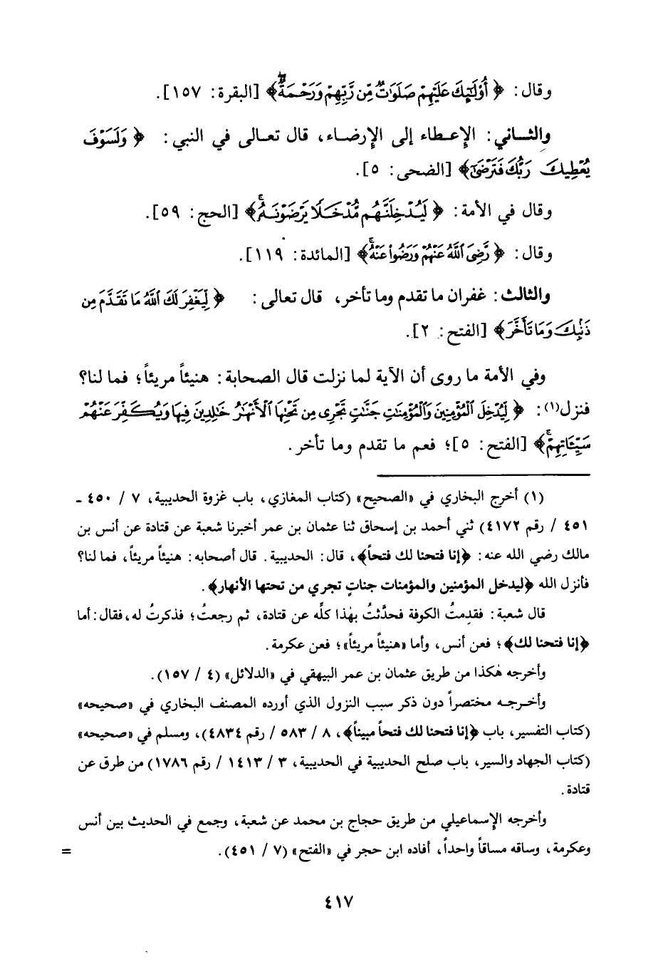 1 أخرج البخاري في "الصحيح" "كتاب المغازي، باب غزوة الحديبية 7/ 450-451/ رقم 4172" ثني أحمد بن إسحاق ثنا عثمان بن عمر أخبرنا شعبة عن قتادة عن أنس بن مالك رضي الله عنه: {إِنَّا فَتَحْنَا لَكَ فَتْحًا} ، قال: الحديبية. قال أصحابه: هنيئا مريئا، فما لنا؟ فأنزل الله: {لِيُدْخِلَ الْمُؤْمِنِينَ وَالْمُؤْمِنَاتِ جَنَّاتٍ تَجْرِي مِنْ تَحْتِهَا الْأَنْهَار} .