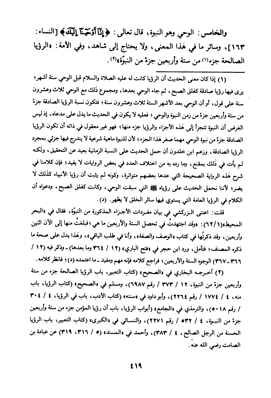 قلت: اعتنى الزركشي في بيان مفردات الأجزاء المذكورة من النبوة، فقال في "البحر المحيط" "1/ 62": "وقد اجتهدت في تحصل الستة والأربعين ما هي، فبلغت منها إلى الآن اثنين وأربعين، وقد ذكرتها في كتاب "الوصف والصفة"، وأنا في طلب الباقي"، وهذا يدل على صحة ما ذكره المصنف، فتأمل، وردَّ ابن حجر في "فتح الباري" "12/ 364 وما بعدها"- وذكر فيه "12/ 366-367" الوجوه الستة والأربعين، فراجع كلامه فإنه كلامه فإنه مهم ومفيد- ما اعتمده "د"، فانظر كلامه.