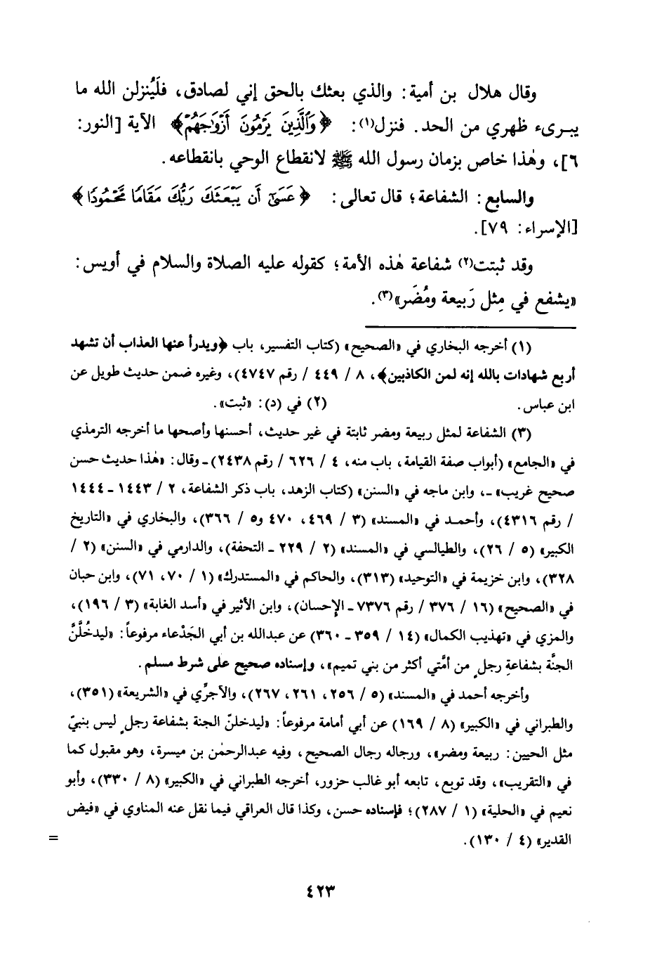 وَقَدْ ثَبَتَتْ2 شَفَاعَةُ هَذِهِ الْأُمَّةِ، كَقَوْلِهِ عَلَيْهِ الصَّلَاةُ وَالسَّلَامِ فِي أُوَيْسٍ: "يُشَفَّعُ في مثل ربيعة ومضر" 3.