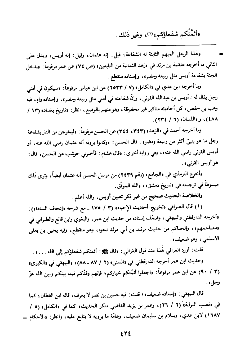 وما أخرجه أحمد في "الزهد" "343، 344" عن الحسن مرفوعا: "ليخرجن من النار بشفاعة رجل ما هو بنبي أكثر من ربيعة ومضر": قال الحسن: "وكانوا يرون أنه عثمان رضي الله عنه، أو أويس القرني رضي الله عنه"، وفي رواية أخرى: "قال هشام: فأخبرني حوشب عن الحسن، قال: هو أويس القرني".