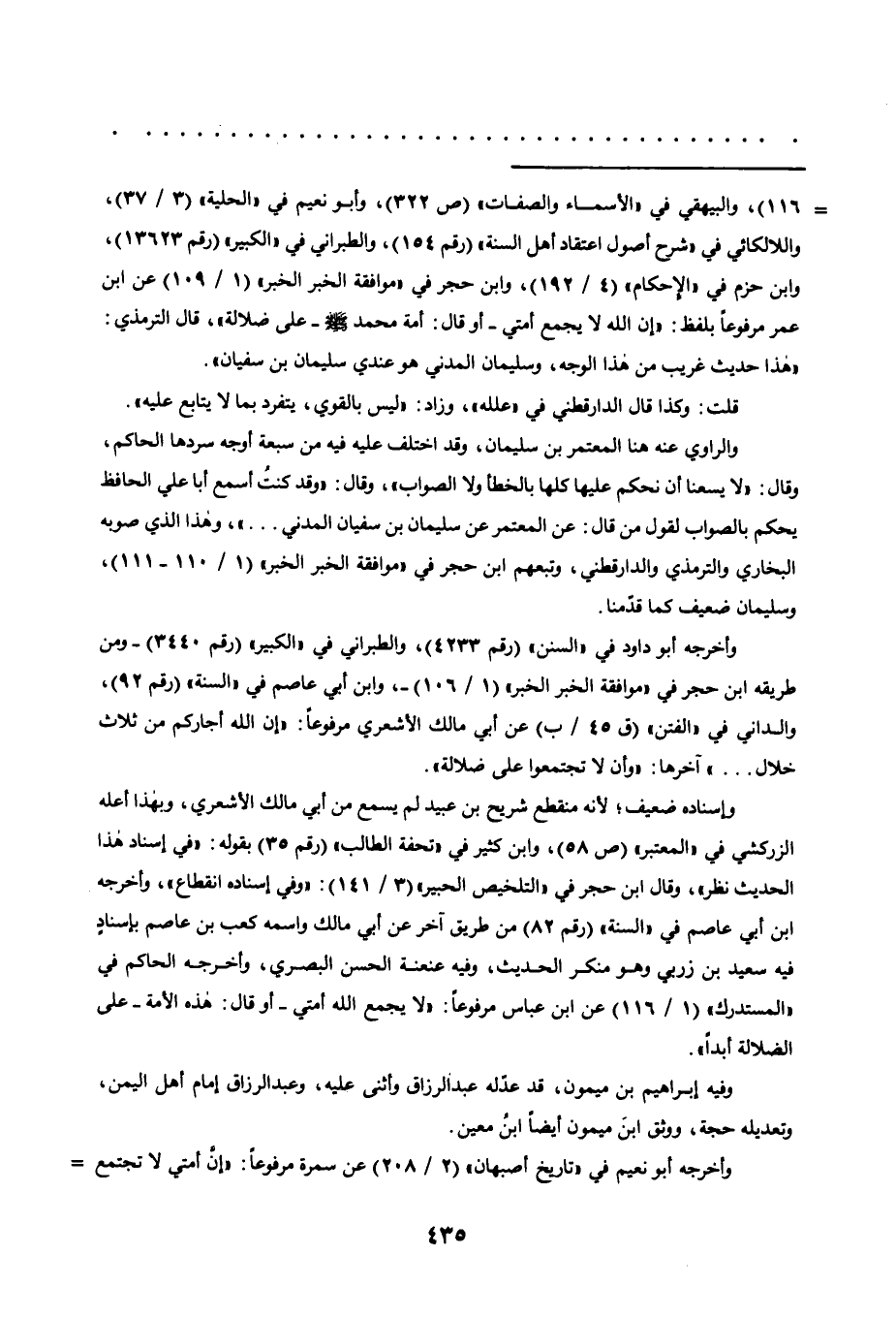 = 116"، والبيهقي في "الأسماء والصفات" "ص322"، وأبو نعيم في "الحلية" "3/ 37"، واللالكائي في "شرح أصول اعتقاد أهل السنة" "رقم 154"، والطبراني في الكبير" "رقم 13623"، وابن حزم في "الإحكام" "4/ 192"، وابن حجر في "موافقة الخبر الخبر" "1/ 109" عن ابن عمر مرفوعا بلفظ: "إن الله لا يجمع أمتي -أو قال: أمة محمد صلى الله عليه وسلم- على ضلالة"، قال الترمذي: "هذا حديث غريب من هذا الوجه، وسليمان المدني هو عندي سليمان بن سفيان".