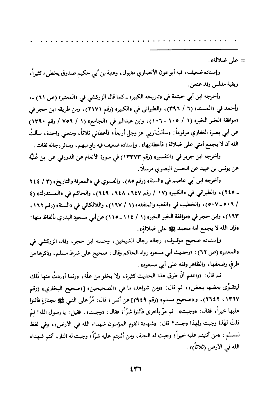 وأخرجه ابن أبي عاصم في "السنة" "رقم 85"، والفسوي في "المعرفة والتاريخ" "3/ 244-245"، والطبراني في "الكبير" "17/ رقم 647، 648، 649"، والحاكم في "المستدرك" "4/ 506-507"، والخطيب في "الفقيه والمتفقه" "1/ 167، واللالكائي في "السنة" رقم 162، 163"، وابن حجر في "موافقة الخبر الخبر" "1/ 114-115" عن أبي مسعود البدري بألفاظ منها: "فإن الله لا يجمع أمة محمد صلى الله عليه وسلم على ضلالته".