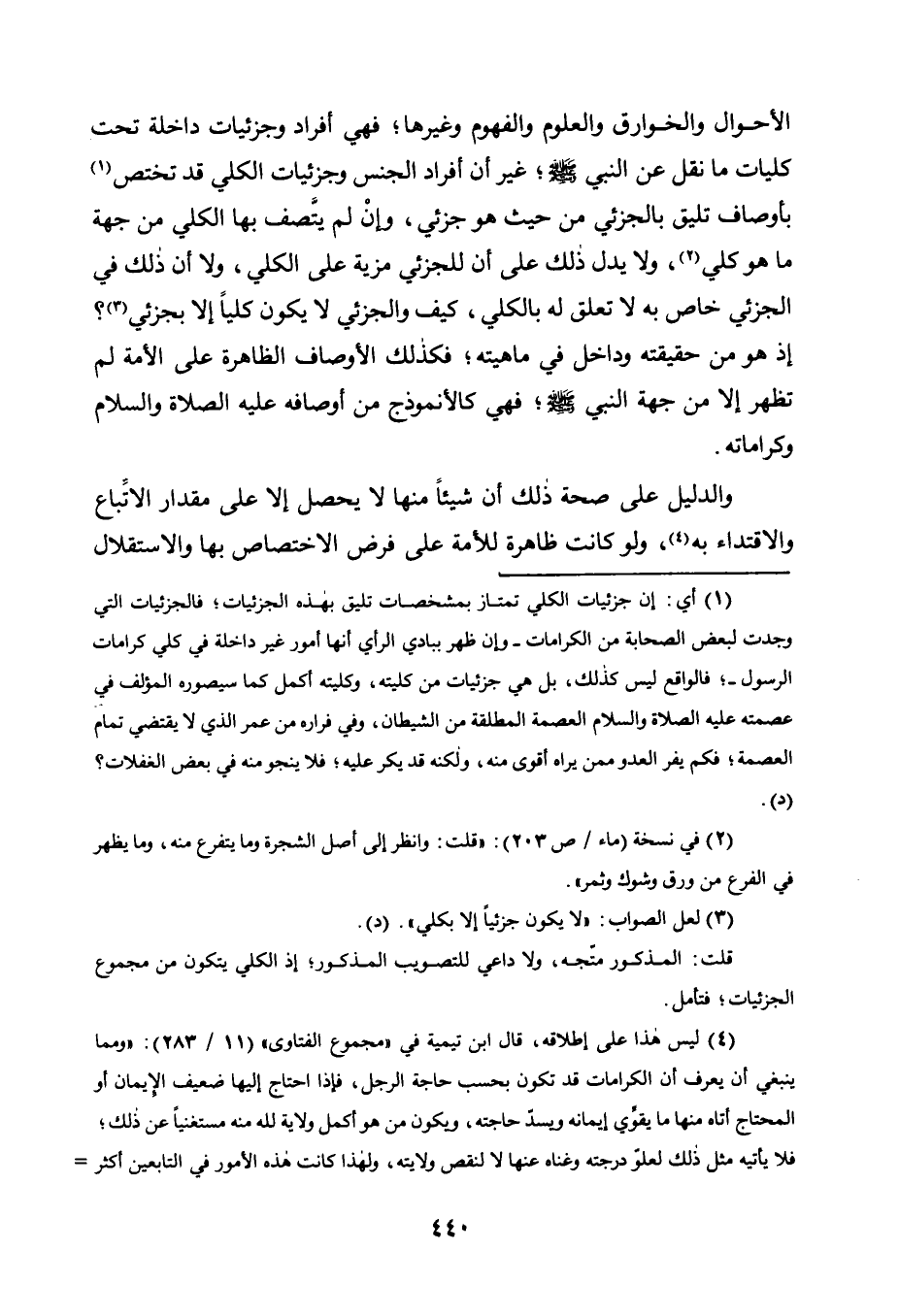 الْأَحْوَالِ وَالْخَوَارِقِ وَالْعُلُومِ وَالْفُهُومِ وَغَيْرِهَا، فَهِيَ أَفْرَادٌ وَجُزْئِيَّاتٌ دَاخِلَةٌ تَحْتَ كُلِّيَّاتِ مَا نُقِلَ عَنِ النبي صلى الله عليه وسلم، غير أَفْرَادَ الْجِنْسِ وَجُزْئِيَّاتِ الْكُلِّيِّ قَدْ تَخْتَصُّ1 بِأَوْصَافٍ تَلِيقُ بِالْجُزْئِيِّ مِنْ حَيْثُ هُوَ جُزْئِيٌّ، وَإِنْ لَمْ يَتَّصِفْ بِهَا الْكُلِّيُّ مِنْ جِهَةِ مَا هُوَ كُلِّيٌّ2، وَلَا يَدُلُّ ذَلِكَ عَلَى أَنَّ لِلْجُزْئِيِّ مَزِيَّةٌ عَلَى الْكُلِّيِّ، وَلَا أَنَّ ذَلِكَ فِي الْجُزْئِيِّ خَاصٌّ بِهِ لَا تَعَلُّقَ لَهُ بِالْكُلِّيِّ، كَيْفَ وَالْجُزْئِيُّ لَا يَكُونُ كُلِّيًّا إِلَّا بِجُزْئِيٍّ3؟ إِذْ هُوَ مِنْ حَقِيقَتِهِ وَدَاخِلٌ فِي مَاهِيَّتِهِ، فَكَذَلِكَ الْأَوْصَافُ الظَّاهِرَةُ عَلَى الْأُمَّةِ لَمْ تَظْهَرْ إِلَّا مِنْ جِهَةِ النَّبِيِّ صَلَّى اللَّهُ عَلَيْهِ وَسَلَّمَ فَهِيَ كَالْأُنْمُوذَجِ مِنْ أَوْصَافِهِ عَلَيْهِ الصَّلَاةُ وَالسَّلَامُ وَكَرَامَاتِهِ.
