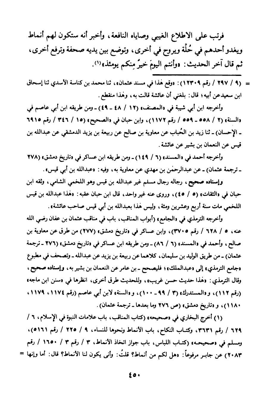 = "9/ 297/ رقم 12309": "وقع هذا في مسند عثمان"، ثنا محمد بن كناسة الأسدي ثنا إسحاق ابن سعيد عن أبيه، قال: بلغني أن عائشة قالت به، وهذا منقطع.