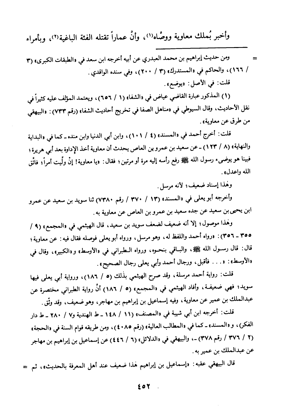 1 المذكور عبارة القاضي عياض في "الشفا" "1/ 656"، ويعتمد المؤلف عليه كثيرا في نقل الأحاديث، وقال السيوطي في "مناهل الصفا في تخريج أحاديث الشفا" "رقم 733": "البيهقي من طرق عن معاوية".