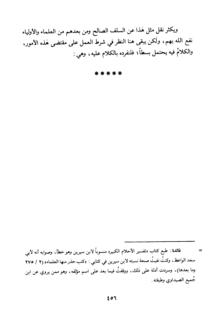 وَيَكْثُرُ نَقْلُ مِثْلِ هَذَا عَنِ السَّلَفِ الصَّالِحِ وَمَنْ بَعْدَهُمْ مِنَ الْعُلَمَاءِ وَالْأَوْلِيَاءِ نَفَعَ اللَّهُ بِهِمْ وَلَكِنْ يَبْقَى هُنَا النَّظَرُ فِي شَرْطِ الْعَمَلِ عَلَى مُقْتَضَى هَذِهِ الْأُمُورِ، وَالْكَلَامُ فِيهِ يَحْتَمِلُ بَسْطًا، فَلْنُفْرِدْهُ بِالْكَلَامِ عَلَيْهِ، وَهِيَ: