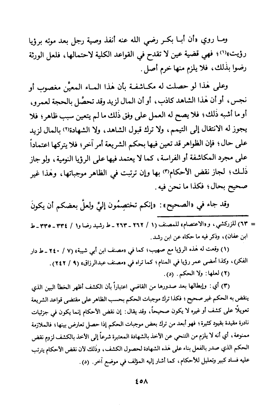 وَمَا رُوِيَ "أَنَّ أَبَا بَكْرٍ رَضِيَ اللَّهُ عَنْهُ أَنْفَذَ وَصِيَّةَ رَجُلٍ بَعْدَ مَوْتِهِ بِرُؤْيَا رؤيت"1، فَهِيَ قَضِيَّةُ عَيْنٍ لَا تَقْدَحُ فِي الْقَوَاعِدِ الْكُلِّيَّةِ لِاحْتِمَالِهَا، فَلَعَلَّ الْوَرَثَةَ رَضُوا بِذَلِكَ، فَلَا يَلْزَمُ مِنْهَا خَرْمُ أَصْلٍ.