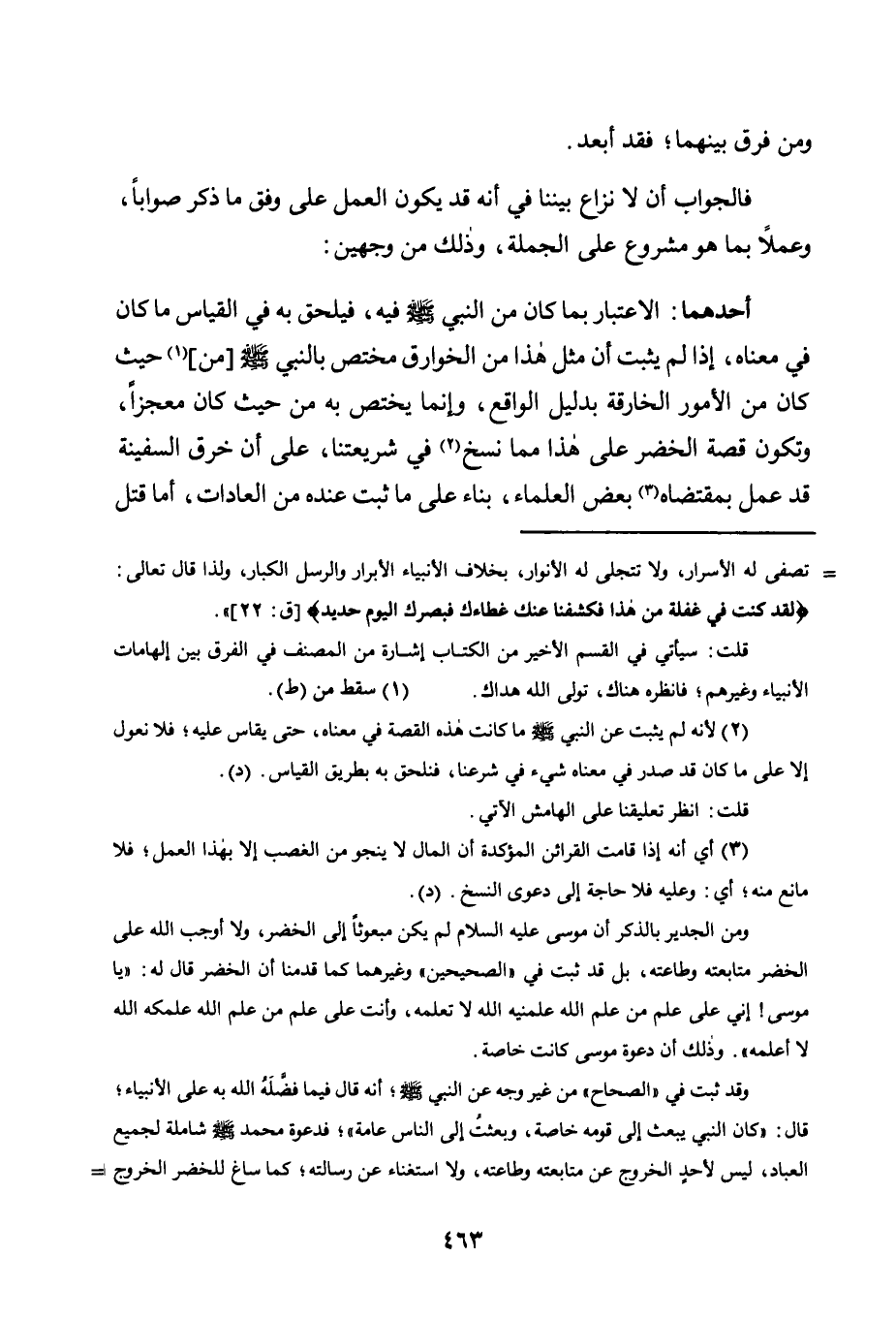 الِاعْتِبَارُ بِمَا كَانَ مِنَ النَّبِيِّ صَلَّى اللَّهُ عَلَيْهِ وَسَلَّمَ فِيهِ، فَيَلْحَقُ بِهِ فِي الْقِيَاسِ مَا كَانَ فِي مَعْنَاهُ، إِذَا لَمْ يَثْبُتُ أَنَّ مِثْلَ هَذَا مِنَ الْخَوَارِقِ مُخْتَصٌّ بِالنَّبِيِّ صَلَّى اللَّهُ عَلَيْهِ وَسَلَّمَ [مِنْ] 1 حَيْثُ كَانَ مِنَ الْأُمُورِ الْخَارِقَةِ بِدَلِيلِ الْوَاقِعِ، وَإِنَّمَا يَخْتَصُّ بِهِ مِنْ حَيْثُ كَانَ مُعْجِزًا، وَتَكُونُ قِصَّةُ الْخَضِرِ عَلَى هَذَا مِمَّا نُسِخَ2 فِي شَرِيعَتِنَا، عَلَى أَنَّ خَرْقَ السَّفِينَةِ قَدْ عَمِلَ بِمُقْتَضَاهُ3 بَعْضُ الْعُلَمَاءِ، بِنَاءً عَلَى مَا ثبت عنده من العادات، أما قتل