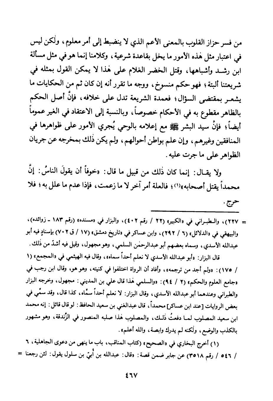 مَنْ فَسَّرَ حَزَّازَ الْقُلُوبِ بِالْمَعْنَى الْأَعَمِّ الَّذِي لَا يَنْضَبِطُ إِلَى أَمْرٍ مَعْلُومٍ، وَلَكِنْ لَيْسَ فِي اعْتِبَارِ مِثْلِ هَذِهِ الْأُمُورِ مَا يُخِلُّ بِقَاعِدَةٍ شَرْعِيَّةٍ، وَكَلَامُنَا إِنَّمَا هُوَ فِي مِثْلِ مَسْأَلَةِ ابْنِ رُشْدٍ وَأَشْبَاهِهَا، وَقَتْلِ الْخَضِرِ الْغُلَامَ عَلَى هَذَا لَا يُمْكِنُ الْقَوْلُ بِمِثْلِهِ فِي شَرِيعَتِنَا الْبَتَّةَ، فَهُوَ حَكَمٌ مَنْسُوخٌ، وَوَجْهُ مَا تَقَرَّرَ أَنَّهُ إِنْ كَانَ ثَمَّ مِنَ الْحِكَايَاتِ مَا يُشْعِرُ بِمُقْتَضَى السُّؤَالِ، فَعُمْدَةُ الشَّرِيعَةِ تَدُلُّ عَلَى خِلَافِهِ، فَإِنَّ أَصْلَ الْحُكْمِ بِالظَّاهِرِ مَقْطُوعٌ بِهِ فِي الْأَحْكَامِ خُصُوصًا، وَبِالنِّسْبَةِ إِلَى الِاعْتِقَادِ فِي الْغَيْرِ عُمُومًا أَيْضًا، فَإِنَّ سَيِّدَ الْبَشَرِ صَلَّى اللَّهُ عَلَيْهِ وَسَلَّمَ مَعَ إِعْلَامِهِ بِالْوَحْيِ يُجْرِي الْأُمُورَ عَلَى ظَوَاهِرِهَا فِي الْمُنَافِقِينَ وَغَيْرِهِمْ، وَإِنْ عَلِمَ بَوَاطِنَ أَحْوَالِهِمْ، وَلَمْ يَكُنْ ذَلِكَ بِمُخْرِجِهِ عَنْ جَرَيَانِ الظَّوَاهِرِ عَلَى مَا جَرَتْ عَلَيْهِ.