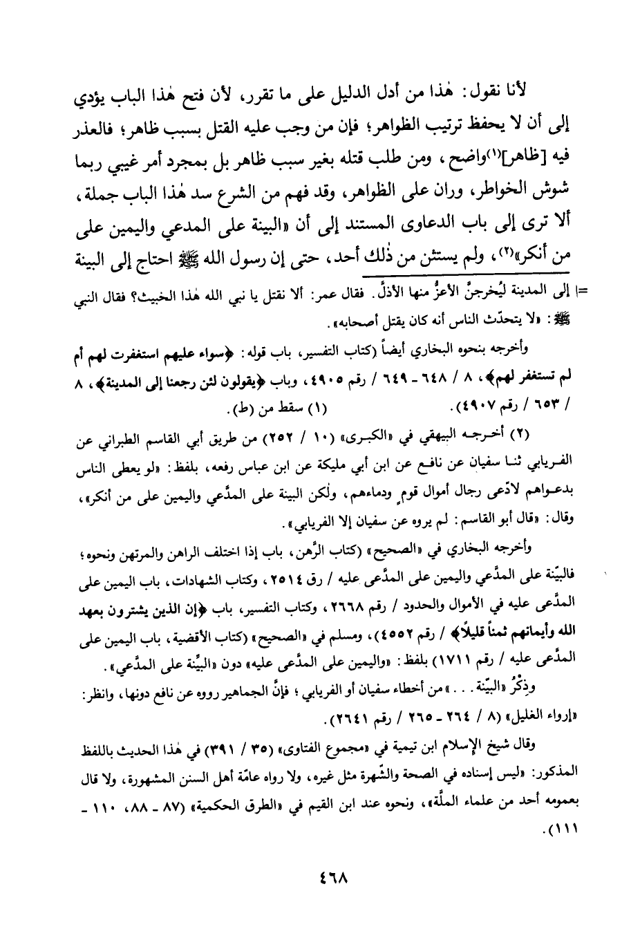 وذكر "البينة....." من أخطاء سفيان أو الفريابي، فإن الجماهير رووه عن نافع دونها، وانظر: "إرواء الغليل" "8/ 264-265/ رقم 2641".