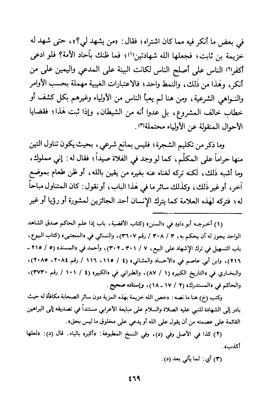 فِي بَعْضِ مَا أَنْكَرَ فِيهِ مِمَّا كَانَ اشْتَرَاهُ، فَقَالَ: "مَنْ يَشْهَدُ لِي؟ "، حَتَّى شَهِدَ لَهُ خُزَيْمَةُ بْنُ ثَابِتٍ، فَجَعَلَهَا اللَّهُ شَهَادَتَيْنِ1، فَمَا ظَنُّكَ بِآحَادِ الْأُمَّةِ؟ فَلَوِ ادَّعَى أَكْفَرُ2 النَّاسِ عَلَى أَصْلَحِ النَّاسِ لَكَانَتِ الْبَيِّنَةُ عَلَى الْمُدَّعِي وَالْيَمِينُ عَلَى مَنْ أَنْكَرَ، وَهَذَا مِنْ ذَلِكَ، وَالنَّمَطُ وَاحِدٌ، فَالِاعْتِبَارَاتُ الْغَيْبِيَّةُ مُهْمَلَةٌ بِحَسَبِ الْأَوَامِرِ وَالنَّوَاهِي الشَّرْعِيَّةِ، وَمِنْ هُنَا لَمْ يَعْبَأِ النَّاسُ مِنَ الْأَوْلِيَاءِ وَغَيْرِهِمْ بِكُلِّ كَشْفٍ أَوْ خِطَابٍ خَالَفَ الْمَشْرُوعَ، بَلْ عدُّوا أَنَّهُ مِنَ الشَّيْطَانِ، وَإِذَا ثَبَتَ هَذَا، فَقَضَايَا الْأَحْوَالِ الْمَنْقُولَةِ عَنِ الْأَوْلِيَاءِ مُحْتَمَلَةٌ3.