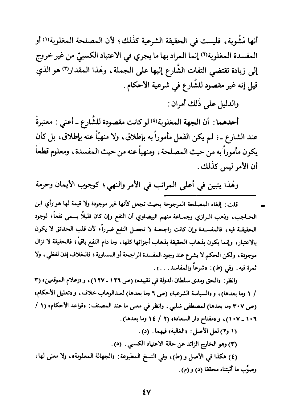 أن الجهة المغلوبة4 لَوْ كَانَتْ مَقْصُودَةً لِلشَّارِعِ -أَعْنِي: مُعْتَبَرَةً عِنْدَ الشَّارِعِ-، لَمْ يَكُنِ الْفِعْلُ مَأْمُورًا بِهِ بِإِطْلَاقٍ، وَلَا مَنْهِيًّا عَنْهُ بِإِطْلَاقٍ، بَلْ كَانَ يَكُونُ مَأْمُورًا بِهِ مِنْ حَيْثُ الْمَصْلَحَةِ، وَمَنْهِيًّا عَنْهُ مِنْ حَيْثُ الْمَفْسَدَةِ، وَمَعْلُومٌ قَطْعًا أَنَّ الْأَمْرَ لَيْسَ كَذَلِكَ.