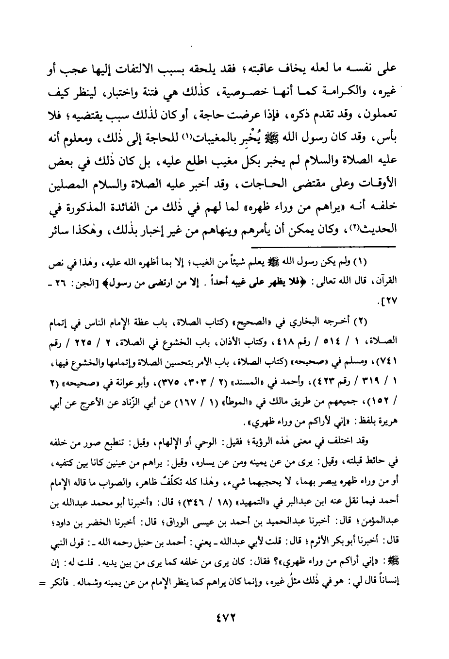 وقد اختُلِف في معنى هذه الرؤية، فقيل: الوحي أو الإلهام، وقيل: تنطبع صور من خلفه في حائط قبلته، وقيل: يرى من عن يمينه ومن عن يساره، وقيل: يراهم من عينين كانا بين كتفيه، أو من وراء ظهره يبصر بهما، لا يحجبهما شيء، وهذا كله تكلف ظاهر، والصواب ما قاله الإمام أحمد فيما نقل عنه ابن عبد البر في "التمهيد" "18/ 346"، قال: "أخبرنا أبو محمد عبد الله بن عبد المؤمن، قال: أخبرنا عبد الحميد بن أحمد بن عيسى الوراق، قال: أخبرنا الخضر بن داود، قال: أخبرنا أبو بكر الأثرم، قال: قلت لأبي عبد الله -يعني: أحمد بن حنبل رحمه الله- قول النبي صلى الله عليه وسلم: "إني أراكم من وراء ظهري"؟ فقال: كان يرى من خلفه كما يرى من بين يديه. قلت له: إن إنسانا قال لي: هو في ذلك مثل غيره، وإنما كان يراهم كما ينظر الإمام من عن يمينه وشماله. فأنكر =