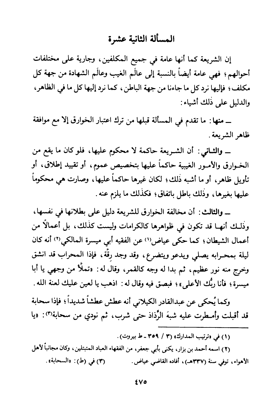 - وَالثَّالِثُ: أَنَّ مُخَالَفَةَ الْخَوَارِقِ لِلشَّرِيعَةِ دَلِيلٌ عَلَى بُطْلَانِهَا فِي نَفْسِهَا، وَذَلِكَ أَنَّهَا قَدْ تَكُونُ فِي ظَوَاهِرِهَا كَالْكَرَامَاتِ وَلَيْسَتْ كَذَلِكَ، بَلْ أَعْمَالًا مِنْ أَعْمَالِ الشَّيْطَانِ، كَمَا حَكَى عِيَاضٌ1 عَنِ الْفَقِيهِ أَبِي مَيْسَرَةِ الْمَالِكِيِّ2 أَنَّهُ كَانَ لَيْلَةً بِمِحْرَابِهِ يُصَلِّي وَيَدْعُو وَيَتَضَرَّعُ، وَقَدْ وَجَدَ رِقَّةً، فَإِذَا الْمِحْرَابُ قَدْ انْشَقَّ وَخَرَجَ مِنْهُ نُورٌ عَظِيمٌ، ثُمَّ بَدَا لَهُ وَجْهٌ كَالْقَمَرِ، وَقَالَ لَهُ: "تَمَلَّأْ مِنْ وَجْهِي يَا أَبَا مَيْسَرَةَ، فَأَنَا رَبُّكَ الْأَعْلَى"، فَبَصَقَ فِيهِ وَقَالَ لَهُ: اذْهَبْ يَا لَعِينُ عَلَيْكَ لَعْنَةُ اللَّهِ.