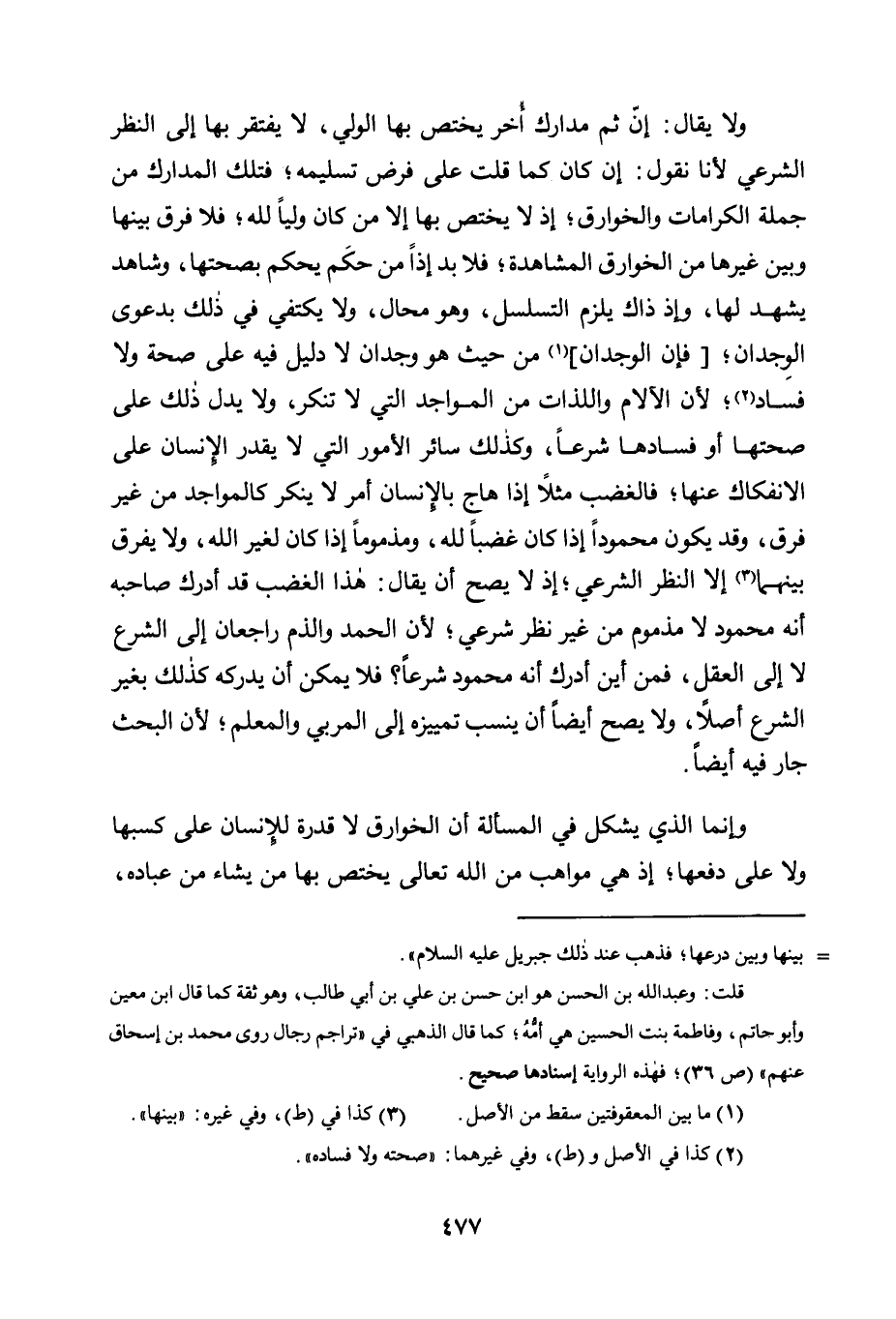 وَلَا يُقَالُ: إِنَّ ثَمَّ مَدَارِكَ أُخَرَ يُخْتَصُّ بها الوالي، لَا يَفْتَقِرُ بِهَا إِلَى النَّظَرِ الشَّرْعِيِّ لِأَنَّا نَقُولُ: إِنْ كَانَ كَمَا قُلْتُ عَلَى فَرْضِ تَسْلِيمِهِ، فَتِلْكَ الْمَدَارِكُ مِنْ جُمْلَةِ الْكَرَامَاتِ وَالْخَوَارِقِ؛ إِذْ لَا يَخْتَصُّ بِهَا إِلَّا مَنْ كَانَ وَلِيًّا لِلَّهِ، فَلَا فَرْقَ بَيْنَهَا وَبَيْنَ غَيْرِهَا مِنَ الْخَوَارِقِ الْمُشَاهَدَةِ، فَلَا بُدَّ إِذًا مِنْ حَكَمٍ يَحْكُمُ بِصِحَّتِهَا، وَشَاهِدٍ يَشْهَدُ لَهَا، وَإِذْ ذَاكَ يَلْزَمُ التَّسَلْسُلُ، وَهُوَ مُحَالٌ، وَلَا يُكْتَفَى فِي ذَلِكَ بِدَعْوَى الْوِجْدَانِ، " [فَإِنَّ الْوِجْدَانَ] 1 مِنْ حَيْثُ هُوَ وِجْدَانٌ لَا دَلِيلَ فِيهِ عَلَى صحة ولا فساد2؛ لِأَنَّ الْآلَامَ وَاللَّذَّاتِ مِنَ الْمَوَاجِدِ الَّتِي لَا تُنْكَرُ، وَلَا يَدُلُّ ذَلِكَ عَلَى صِحَّتِهَا أَوْ فَسَادِهَا شَرْعًا، وَكَذَلِكَ سَائِرُ الْأُمُورِ الَّتِي لَا يَقْدِرُ الْإِنْسَانُ عَلَى الِانْفِكَاكِ عَنْهَا، فَالْغَضَبُ مَثَلًا إِذَا هَاجَ بِالْإِنْسَانِ أَمْرٌ لَا يُنْكَرُ كَالْمَوَاجِدِ مِنْ غَيْرِ فَرْقٍ، وَقَدْ يَكُونُ مَحْمُودًا إِذَا كَانَ غَضَبًا لِلَّهِ، وَمَذْمُومًا إِذَا كَانَ لِغَيْرِ الله، ولا يفرق بينهما3 إِلَّا النَّظَرُ الشَّرْعِيُّ؛ إِذْ لَا يَصِحُّ أَنْ يُقَالَ: هَذَا الْغَضَبُ قَدْ أَدْرَكَ صَاحِبُهُ أَنَّهُ مَحْمُودٌ لَا مَذْمُومٌ مِنْ غَيْرِ نَظَرٍ شَرْعِيٍّ؛ لِأَنَّ الْحَمْدَ وَالذَّمَّ رَاجِعَانِ إِلَى الشَّرْعِ لَا إِلَى الْعَقْلِ، فَمِنْ أَيْنَ أَدْرَكَ أَنَّهُ مَحْمُودٌ شَرْعًا؟ فَلَا يُمْكِنُ أَنْ يُدْرِكَهُ كَذَلِكَ بِغَيْرِ الشَّرْعِ أَصْلًا، وَلَا يَصِحُّ أَيْضًا أَنْ يَنْسُبَ تَمْيِيزَهُ إِلَى الْمُرَبِّي وَالْمُعَلِّمِ؛ لِأَنَّ الْبَحْثَ جارٍ فِيهِ أَيْضًا.