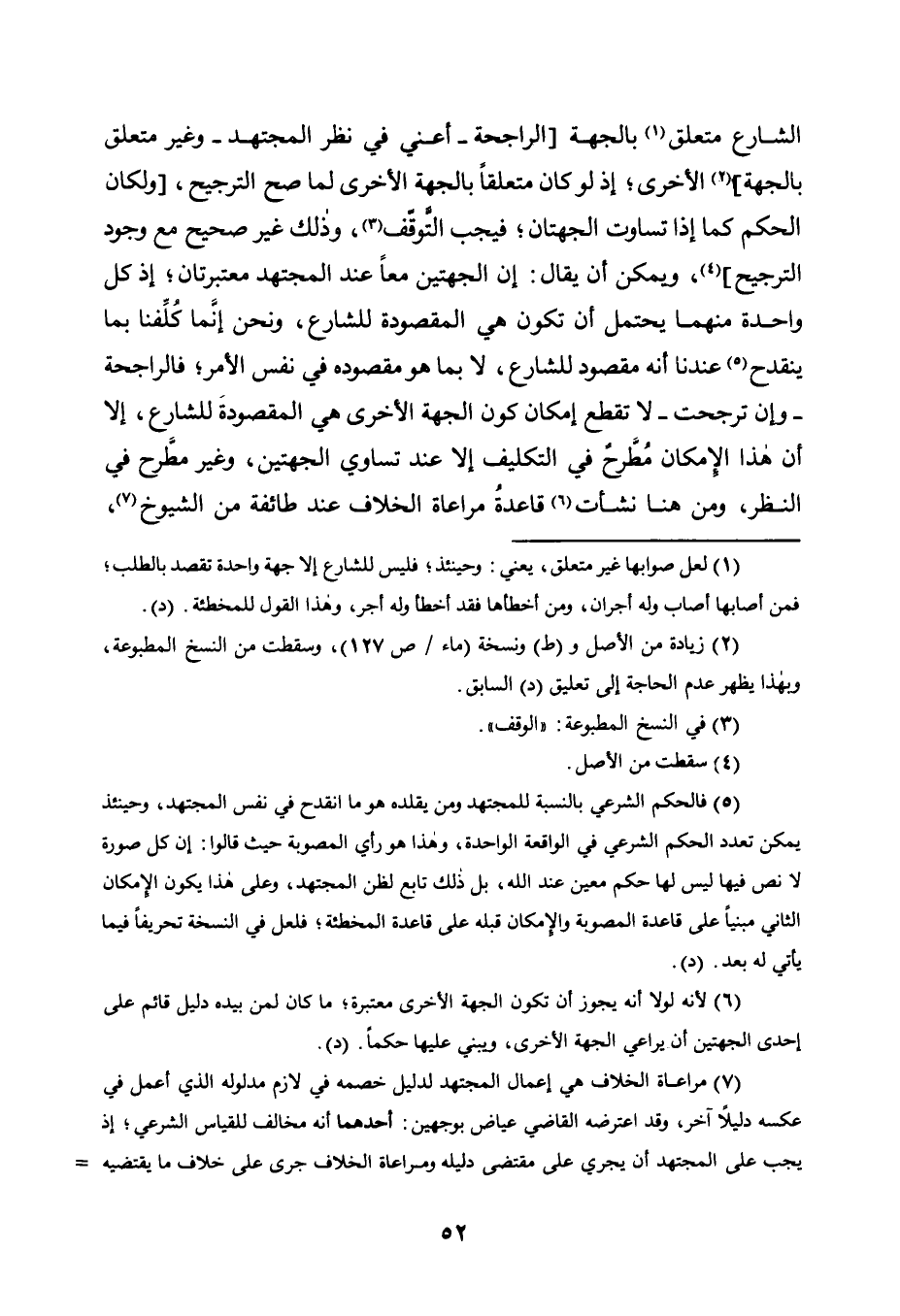 5 فالحكم الشرعي بالنسبة للمجتهد ومن يقلده هو ما انقدح في نفس المجتهد، وحينئذ يمكن تعدد الحكم الشرعي في الواقعة الواحدة، وهذا هو رأي المصوبة حيث قالوا: إن كل صورة لا نص فيها ليس لها حكم معين عند الله، بل ذلك تابع لظن المجتهد، وعلى هذا يكون الإمكان الثاني مبنيا على قاعدة المصوبة والإمكان قبله على قاعدة المخطئة، فلعل في النسخة تحريفا فيما يأتي له بعد."د".
