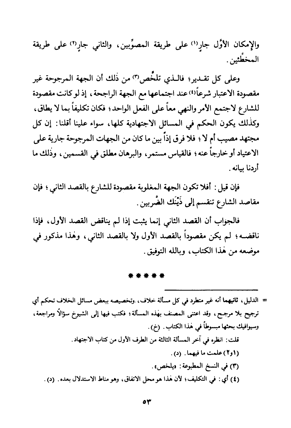 وَالْإِمْكَانُ الْأَوَّلُ جَارٍ1 عَلَى طَرِيقَةِ الْمُصَوِّبِينَ، وَالثَّانِي جَارٍ2 عَلَى طَرِيقَةِ الْمُخَطِّئِينَ.