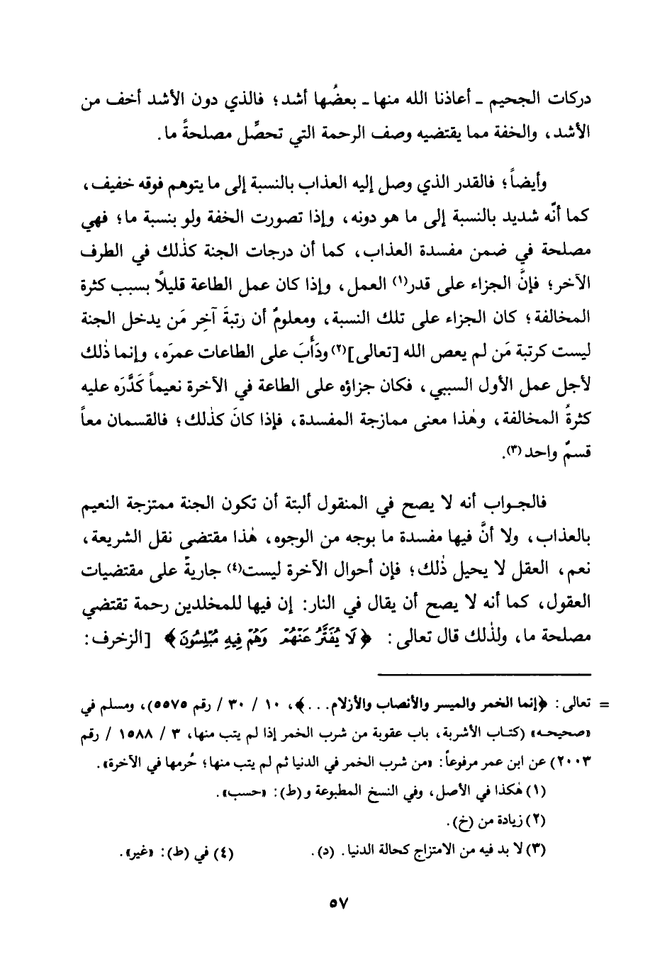 فَالْجَوَابُ أَنَّهُ لَا يَصِحُّ فِي الْمَنْقُولِ أَلْبَتَّةَ أَنْ تَكُونَ الْجَنَّةُ مُمْتَزِجَةَ النَّعِيمِ بِالْعَذَابِ، وَلَا أَنَّ فِيهَا مَفْسَدَةً مَا بِوَجْهٍ مِنَ الْوُجُوهِ، هَذَا مُقْتَضَى نَقْلِ الشَّرِيعَةِ، نَعَمِ، الْعَقْلُ لَا يُحِيلُ ذَلِكَ، فَإِنَّ أَحْوَالَ الْآخِرَةِ لَيْسَتْ4 جَارِيَةً عَلَى مُقْتَضَيَاتِ الْعُقُولِ، كَمَا أَنَّهُ لَا يَصِحُّ أَنْ يُقَالَ فِي النَّارِ: إِنَّ فِيهَا لِلْمُخَلَّدِينَ رَحْمَةً تَقْتَضِي مَصْلَحَةً مَا، وَلِذَلِكَ قَالَ تَعَالَى: {لَا يُفَتَّرُ عَنْهُمْ وَهُمْ فِيهِ مُبْلِسُونَ} [الزخرف:75]