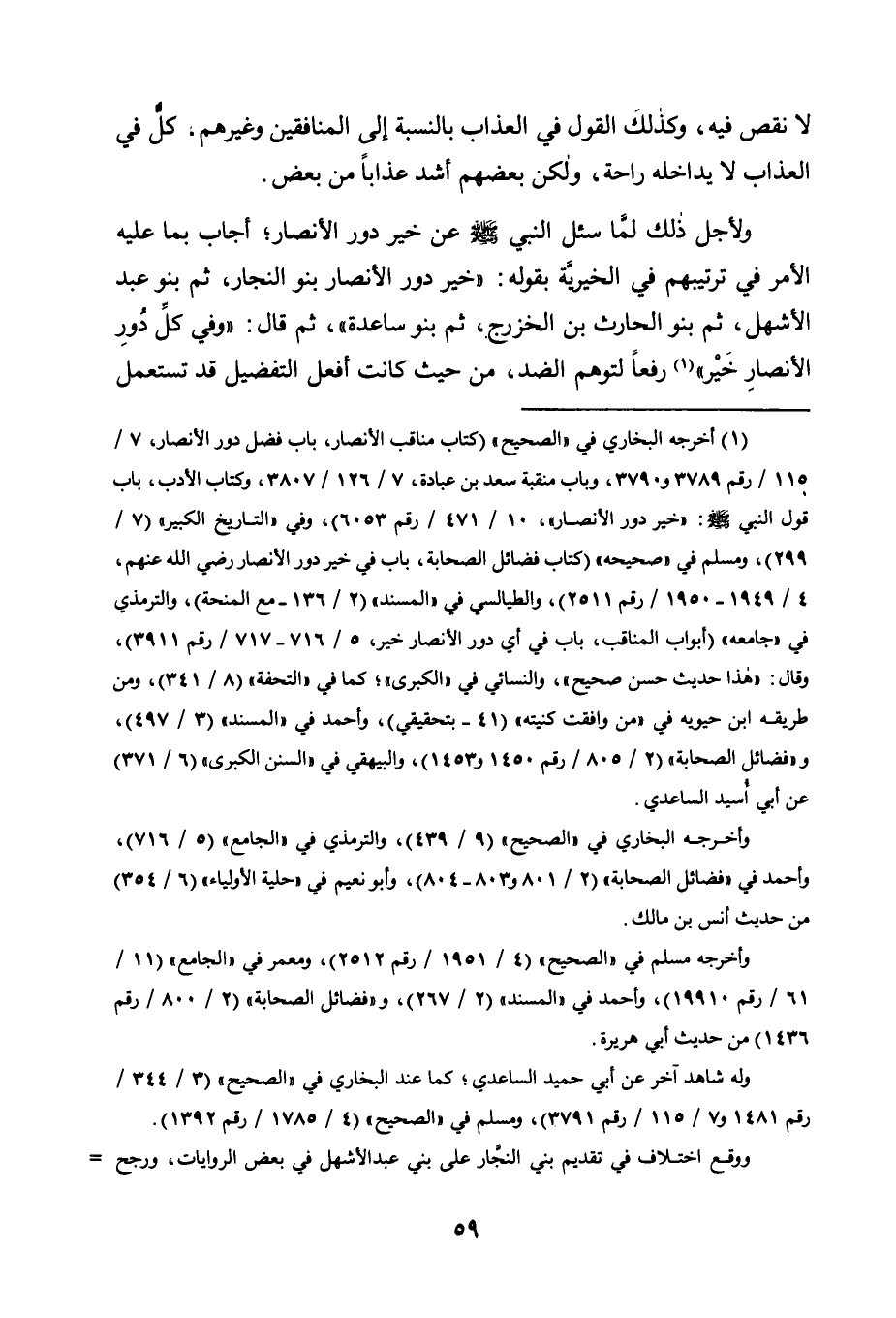 1 أخرجه البخاري في "الصحيح" "كتاب مناقب الأنصار، باب فضل دور الأنصار، 7/ 115/ رقم 3789, 3790، وباب منقبة سعد بن عبادة، 7/ 126/ 3807، وكتاب الأدب، باب قول النبي صَلَّى اللَّهُ عَلَيْهِ وَسَلَّمَ: "خَيْرُ دُورِ الْأَنْصَارِ"، 10/ 471/ رقم 6053" وفي "التاريخ الكبير" "7/ 299"، ومسلم في "صحيحه "كتاب فضائل الصحابة، باب في خير دور الأنصار رضي الله عنهم، 4/ 1949- 1950/ رقم 2511"، والطيالسي في "المسند" "2/ 136- مع المنحة"، والترمذي في "جامعه" "أبواب المناقب، باب في أي دور الأنصار خير، 5/ 716- 717/ رقم 3911"، وقال: "هذا حديث حسن صحيح"، والنسائي في "الكبرى"، كما في "التحفة" "8/ 341"، ومن طريقه ابن حيويه في "من وافقت كنيته" "41- بتحقيقي"، وأحمد في "المسند" "3/ 497"، و"فضائل الصحابة" "2/ 805/ رقم 1450و 1453"، والبيهقي في "السنن الكبرى" "6/ 371" عن أبي أسيد الساعدي.