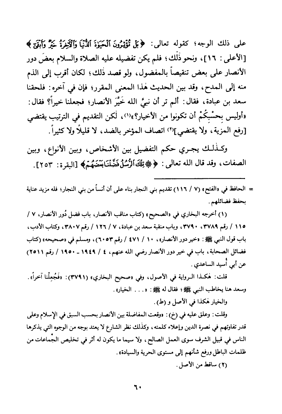عَلَى ذَلِكَ الْوَجْهِ، كَقَوْلِهِ تَعَالَى: {بَلْ تُؤْثِرُونَ الْحَيَاةَ الدُّنْيَا، وَالْآخِرَةُ خَيْرٌ وَأَبْقَى} [الْأَعْلَى: 16] وَنَحْوِ ذَلِكَ، فَلَمْ يَكُنْ تَفْضِيلُهُ عَلَيْهِ الصَّلَاةُ وَالسَّلَامُ بَعْضَ دُورِ الْأَنْصَارِ عَلَى بَعْضٍ تَنْقِيصًا بِالْمَفْضُولِ، وَلَوْ قُصِدَ ذَلِكَ، لَكَانَ أَقْرَبَ إِلَى الذَّمِّ مِنْهُ إِلَى الْمَدْحِ، وَقَدْ بَيَّنَ الْحَدِيثُ هَذَا الْمَعْنَى الْمُقَرَّرَ، فَإِنَّ فِي آخِرِهِ: فَلَحِقَنَا سَعْدُ بْنُ عُبَادَةَ، فَقَالَ: أَلَمْ تَرَ أَنَّ نَبِيَّ الله خير الأنصار، فجعلنا خيرا؟ فَقَالَ: "أَوَلَيْسَ بِحَسْبِكُمْ أنْ تَكُونُوا مَنِ الْأَخْيَارِ؟ "1، لَكِنَّ التَّقْدِيمَ فِي التَّرْتِيبِ يَقْتَضِي [رَفْعَ الْمَزِيَّةِ، وَلَا يَقْتَضِي] 2 اتِّصَافَ الْمُؤَخَّرِ بِالضِّدِّ، لَا قَلِيلًا وَلَا كَثِيرًا.
